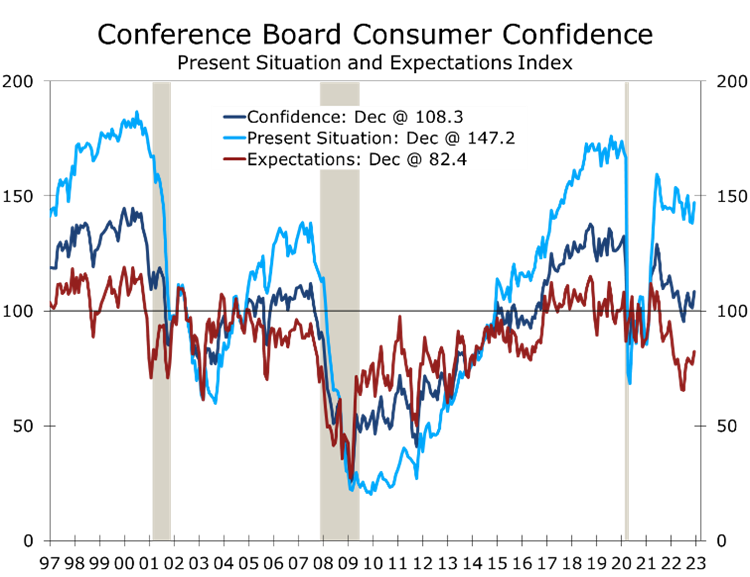 - Consumers’ assessment of current economic conditions rose 8.9 points in December to 147.2, likely benefitting from falling gasoline prices.