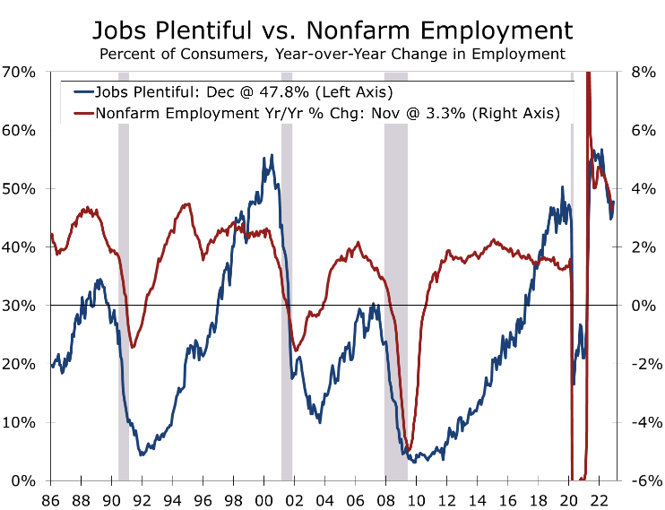 The net share of consumers reporting jobs are plentiful remains consistent with strong overall job growth and is another piece of data hinting that job growth remained strong in December. The mix of jobs is likely not as strong as the overall number being added, however, with a large share of current job growth coming from restaurants and lower paying occupations in health care, education, and other services.