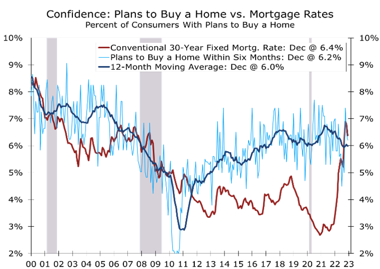 Expectations for job growth remain positive. The share of consumers expecting more jobs to be created over the next 6 months rose 1 point to 19.5%, while the share expecting fewer jobs to be created fell 1.9 points to 18.3%. While that is positive, it is far less upbeat than consumers’ assessment of current employment conditions. Expectations for job growth have likely been scaled back by the growing list of marquee employers announcing cutbacks in the tech sector and elsewhere. Those layoffs have not yet shown up in the weekly unemployment claims or monthly employment data.