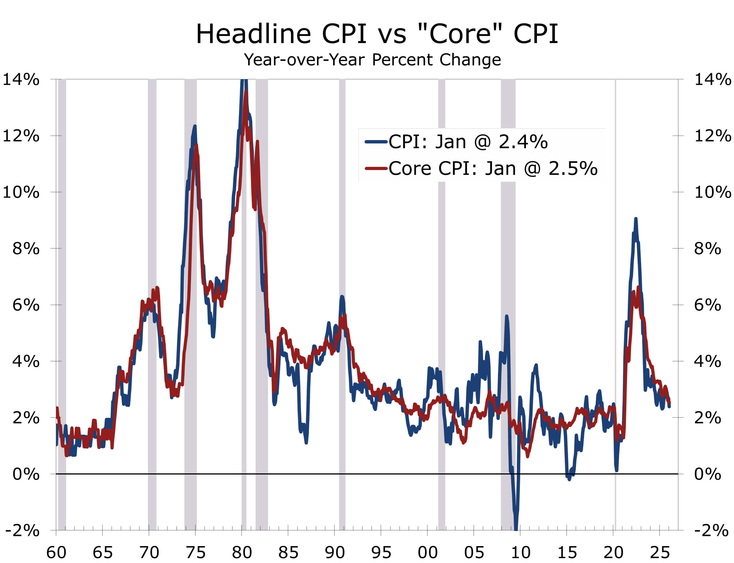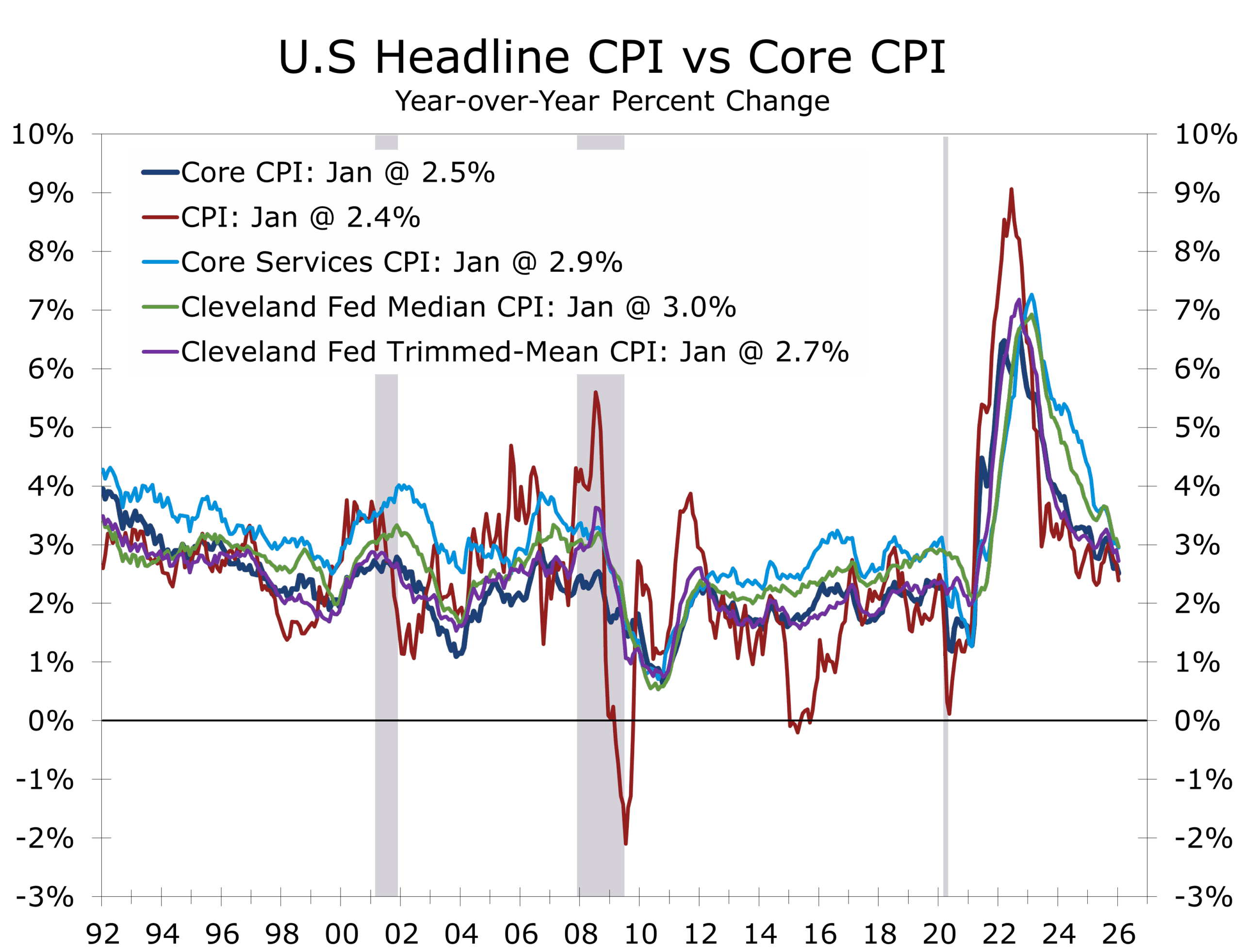 - Headline CPI rose 0.2% in January, slowing the year-over-year rate to 2.4%, the lowest since early 2021.