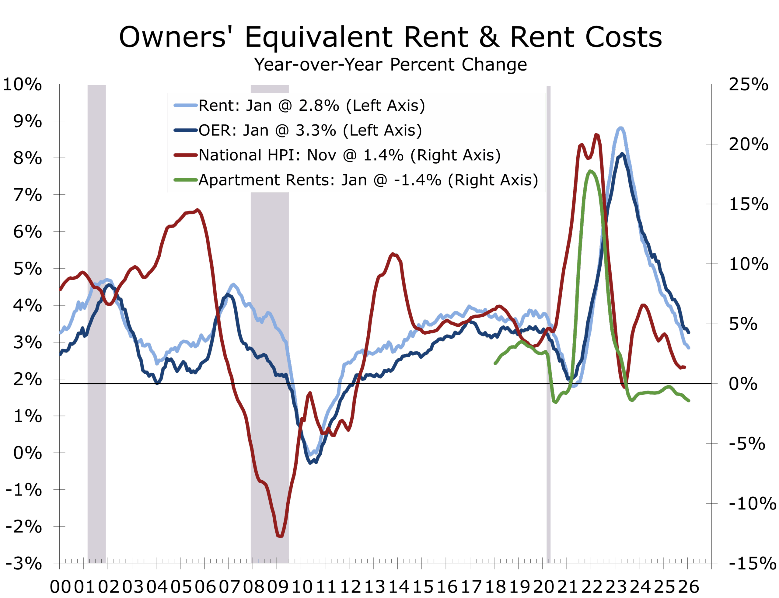 At the same time, home price appreciation has slowed materially as mortgage rates stabilized near 6–6.5%. In several markets, prices have flattened or edged lower. That easing in home price momentum is feeding into OER with a lag.