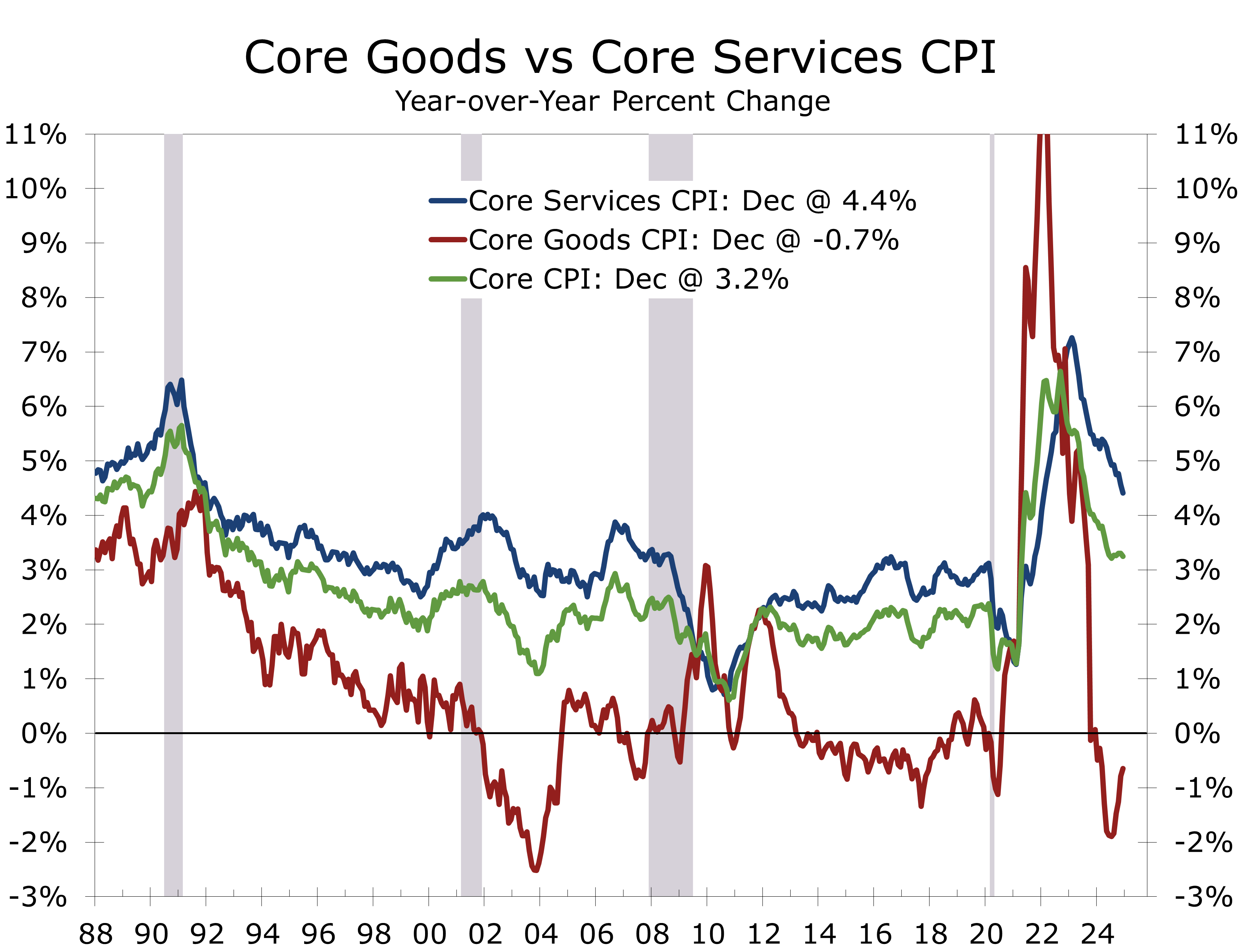 Outside of housing, core CPI showed more stability. Core goods prices edged up 0.1% in December but are down 0.5% year-over-year, primarily due to declines in used (-3.3%) and new (-0.4%) vehicle prices. However, both categories saw increases in December, rising 1.2% and 0.5%, respectively, likely driven by replacement demand after the Southeast’s devastating hurricanes. Replacement demand is also expected to rise in the aftermath of the Los Angeles wildfires.