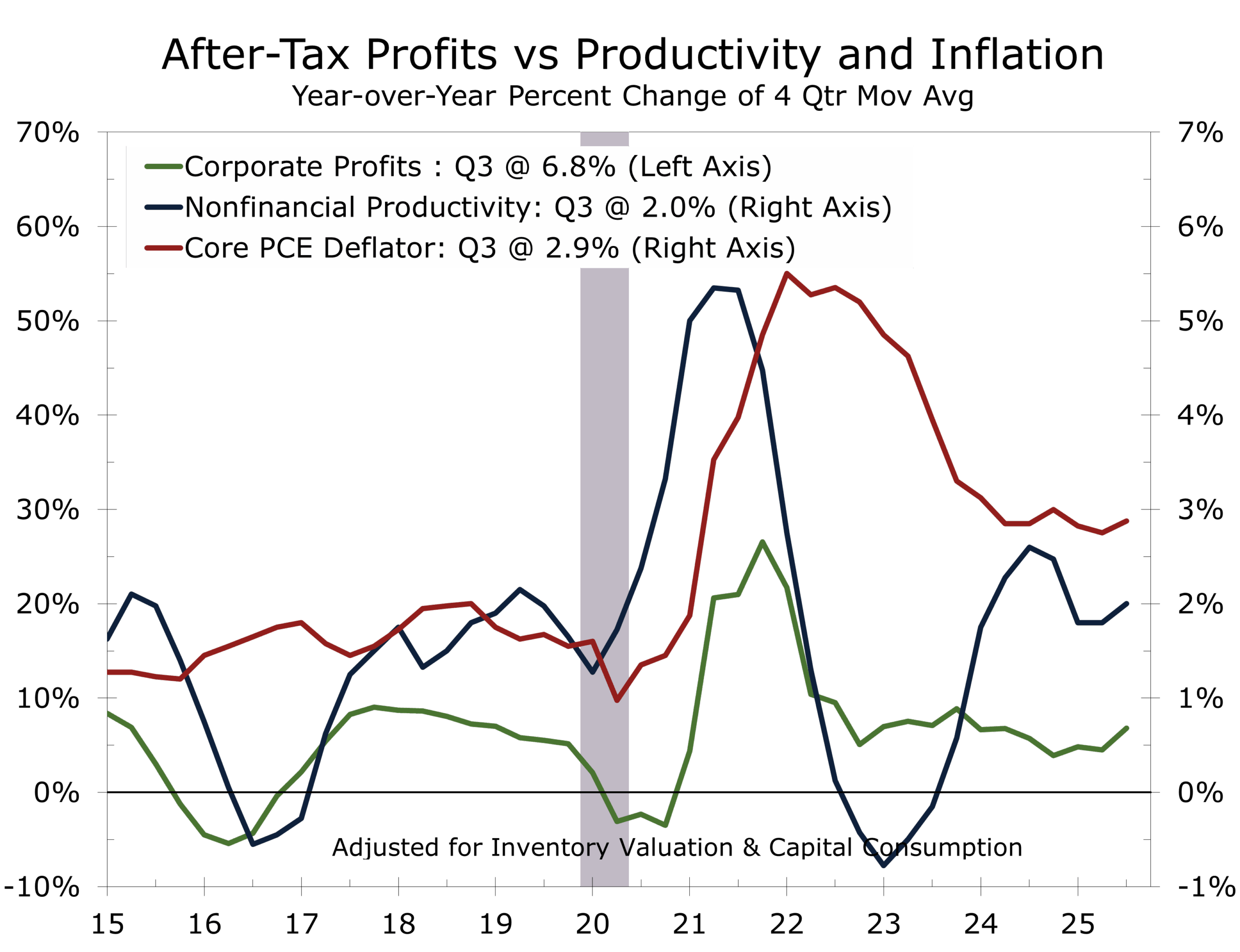 This is also a profit-led expansion, and that distinction is critical. Firms are increasingly generating earnings through efficiency and capital discipline rather than price increases. Margins are being protected by productivity gains even as nominal growth moderates. Profits can grow in a disinflationary environment when costs fall faster than revenues. We are looking for productivity growth to ramp up to a 2.7% pace and look for inflation to fall back toward the Fed’s 2% target by the end of this year. Such a scenario should be good for corporate profits.