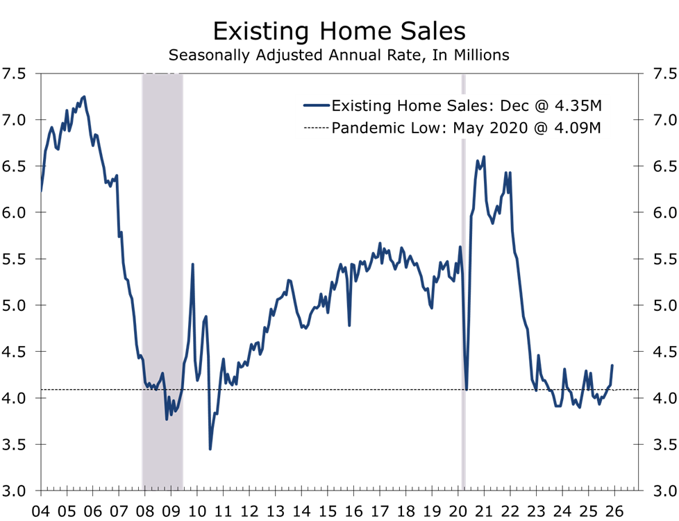 The initial response is showing up in stronger home sales, not a surge in construction. As mortgage rates drift lower and inventories improve at the margin, existing home sales can rebound quickly from depressed levels. Preliminary data suggest sales averaged roughly 4.06 million units in 2025, then firmed late in the year, reaching a 4.35-million-unit pace in December, the strongest reading since early 2023.
