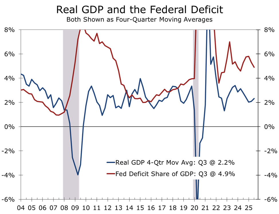 According to the Congressional Budget Office, the deficit totaled roughly $601 billion in the first quarter of FY2026. The Bipartisan Policy Center notes that the CBO projects a $1.7 trillion deficit for FY2026, equivalent to roughly 5½ percent of GDP. That level of borrowing is inconsistent with austerity and continues to provide meaningful macro support.