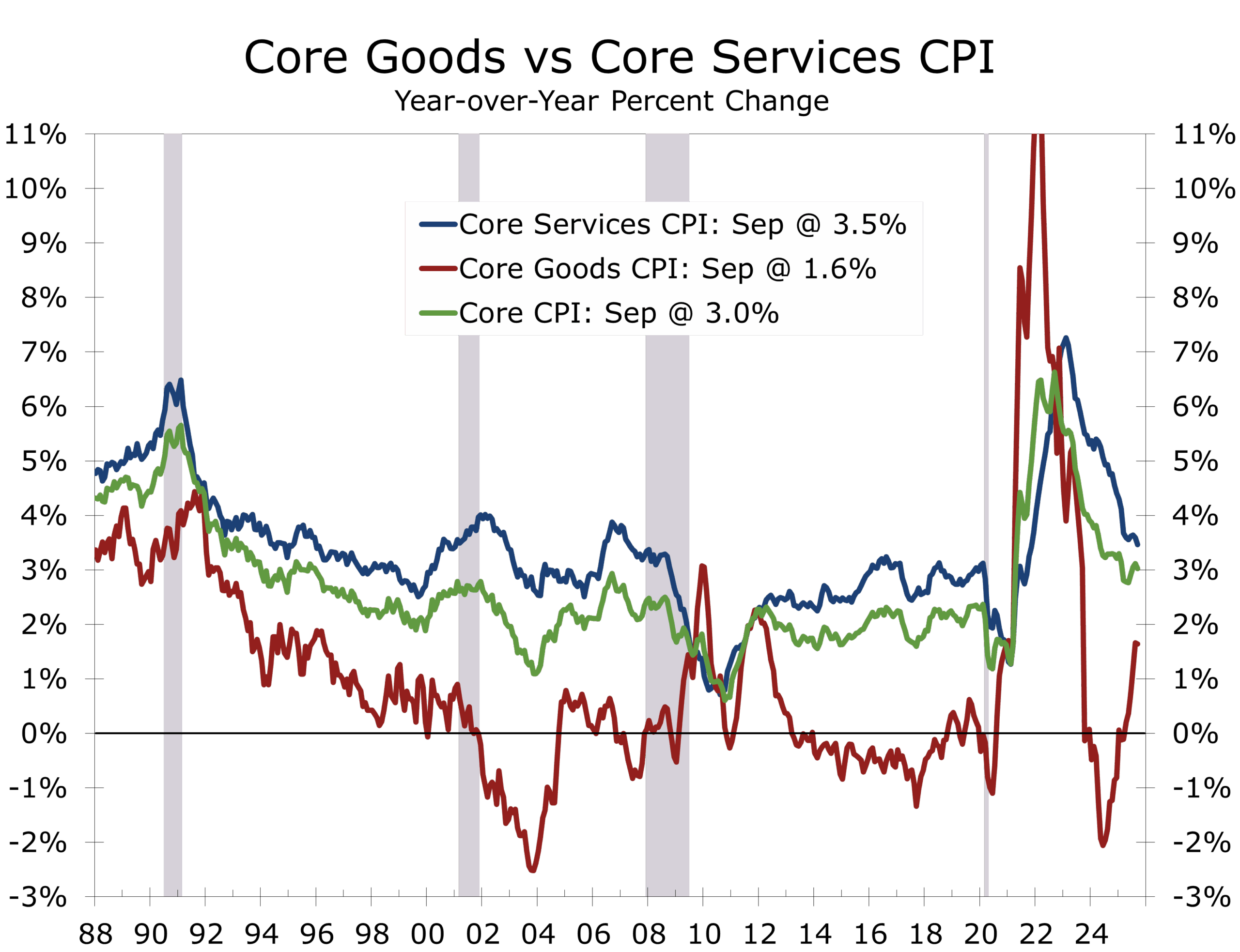 We anticipated the effective tariff rate rising from 2.5% to roughly 10%, while the inflation impact remained limited. Even with more aggressive rhetoric and tactics than expected, the actual pass-through to consumer prices proved far more muted than many feared. We consistently argued that consumers would resist meaningful price increases—given slower income growth and depleted excess savings—and that the pandemic-era inflation spike reflected extraordinary factors (stimulus payments, outsized fiscal spending, and an overly accommodative Fed) that were no longer operative. Moreover, unless the Fed accommodated the rise in tariffs, higher import prices would leave consumers with less money to spend on services, which would slow price increases there.
