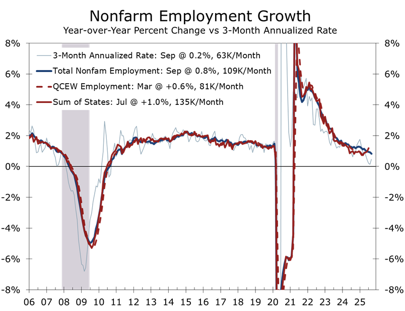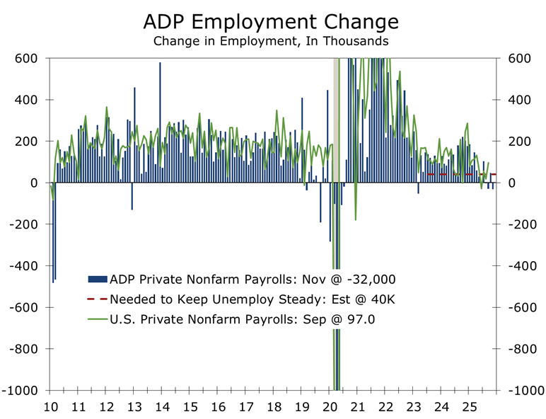 With September still the latest official payroll print, high-frequency indicators—including ADP’s measures—continue to point toward downside risk in private payroll growth, and large downward revisions to 2025 employment expected in early February add further caution. The preliminary QCEW data imply that 911,000 fewer jobs were created from March 2024 to March 2025—roughly 76,000 per month. That slower trend likely extends into the remaining months of 2025. We expect labor-market conditions to remain under pressure early in the year, with monthly nonfarm job growth hovering near zero during the first few months of 2026 before gradually improving to roughly 60,000 per month by year-end. The unemployment rate is likely to rise only modestly, reflecting unusually slow labor-force growth, while wage pressures ease further, with the Employment Cost Index advancing between 3.0% and 3.5%.