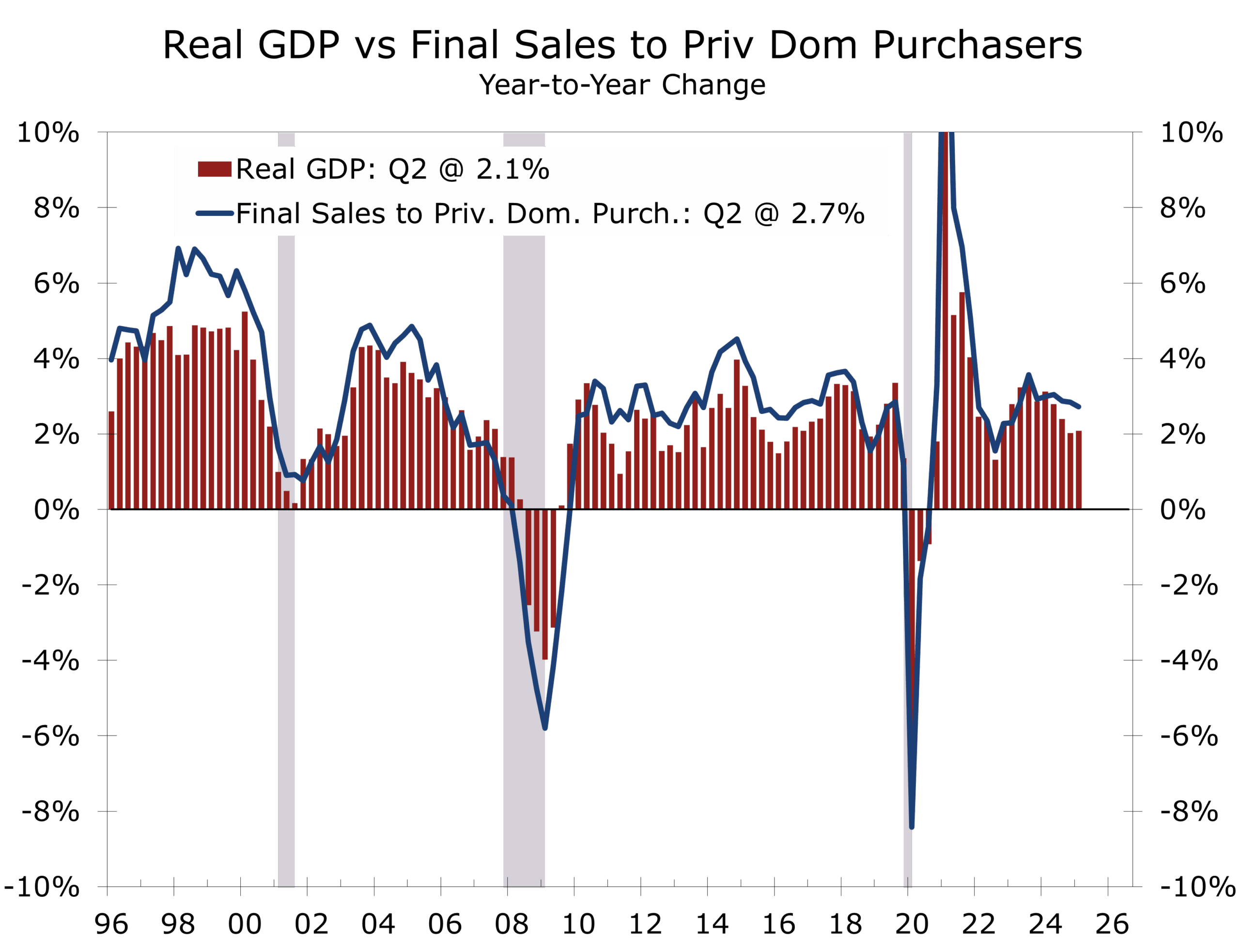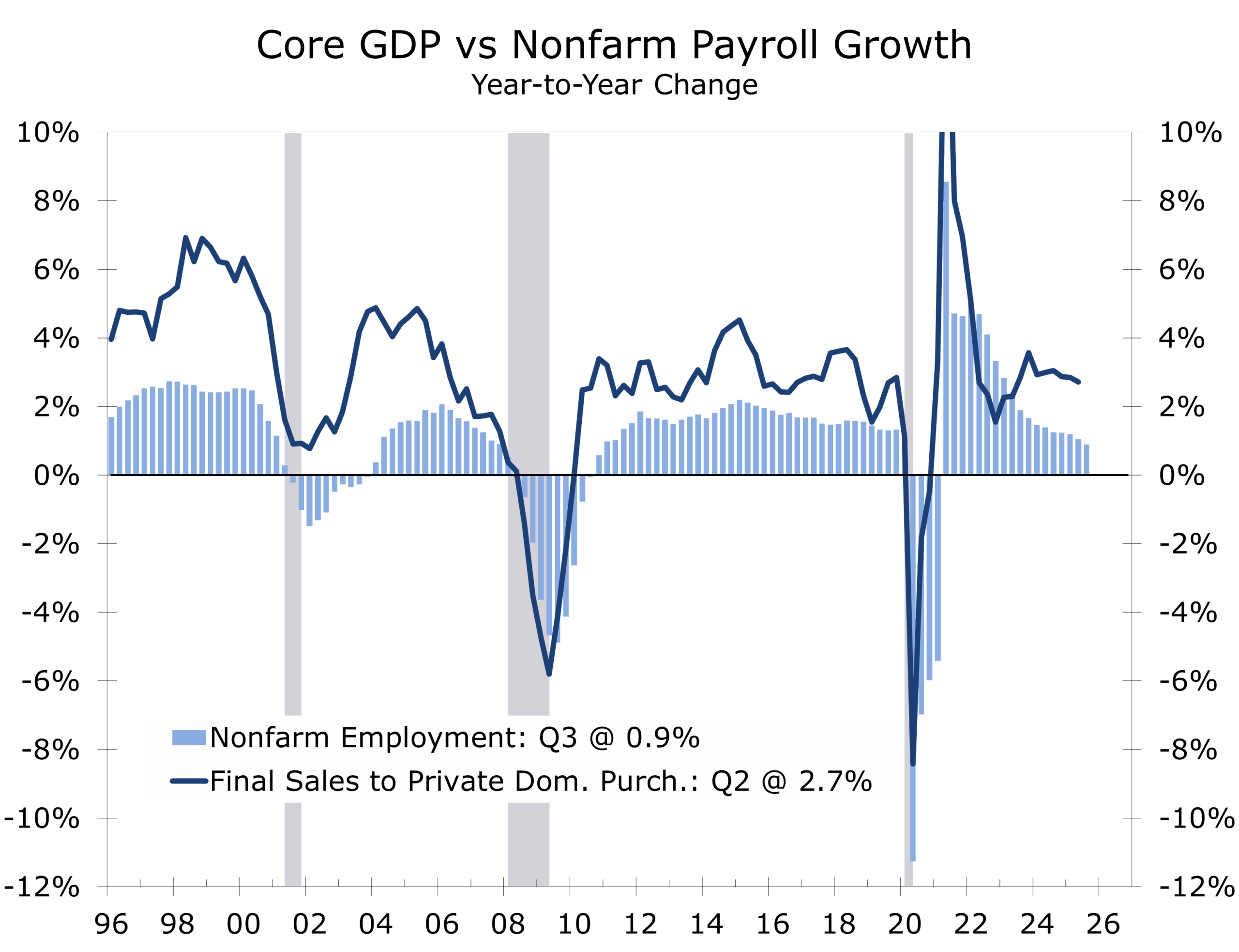 While real GDP swung widely from quarter to quarter, underlying demand remained firm. Real Final Sales to Private Domestic Purchasers—what we refer to as “Core GDP”—likely maintained a better than 2.5% pace into year-end, underscoring stronger momentum than most forecasters anticipated. Private final domestic demand was supported by services spending, business fixed investment, and an unusually long tail of major construction projects. Consumption softened slightly but held up well enough to avoid a more pronounced downshift.