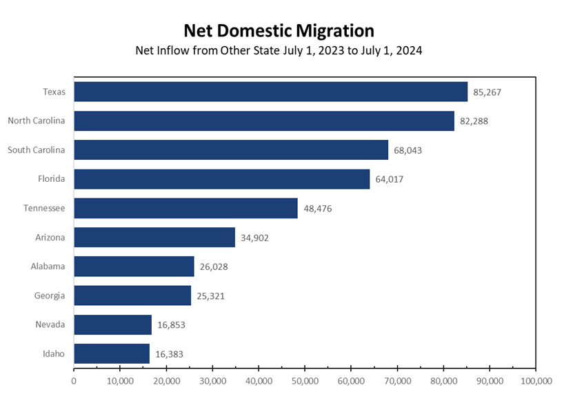 Migration continues to favor the South, where affordability and industrial development remain compelling. These dynamics support faster job growth and stronger capital spending relative to national averages.