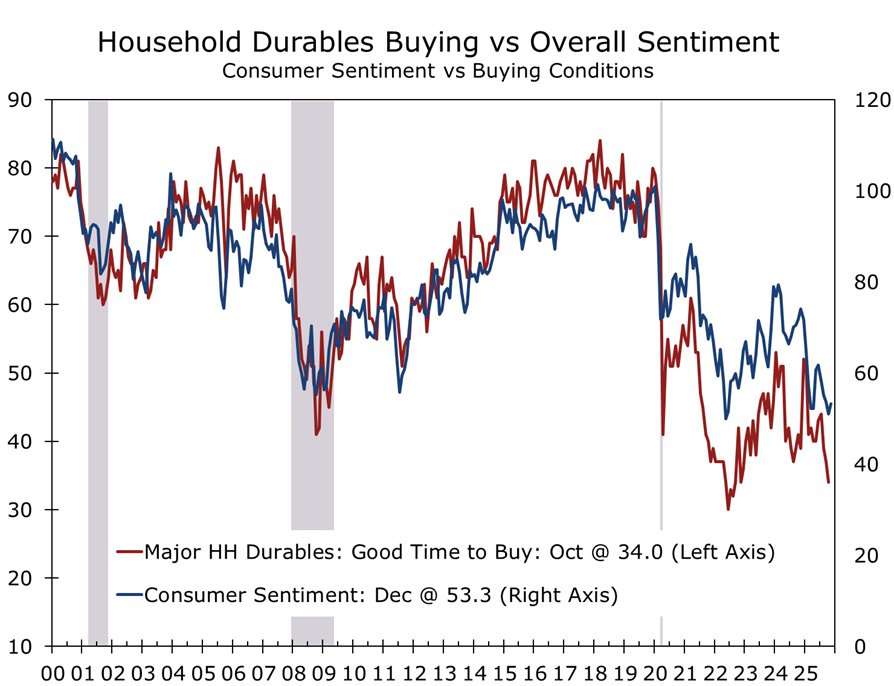 - Lower interest rates and steadier sentiment revive inventory building. Inventory trends were erratic in 2025 as firms first raced to get ahead of tariffs and then paused while waiting for trade policy to settle and supply chains to be reconfigured. With interest rates drifting lower, tariff policy becoming less volatile, and consumer spending and fixed investment holding firm, we expect a modest but meaningful rebound in inventory building in 2026.