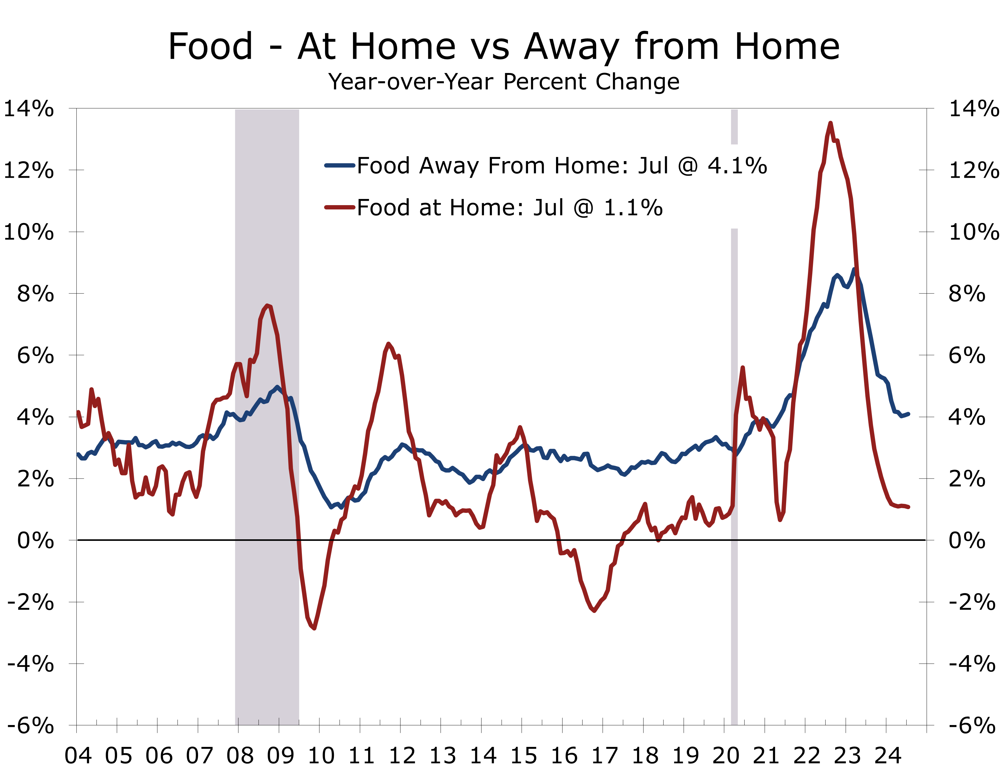Food prices rose by 0.2% in July, maintaining the pace seen in June. Grocery store prices rose 0.1% but the underlying data were mixed, with meats, poultry, fish, and eggs increasing, while cereals, bakery products, and dairy saw slight declines. The consistent rise in food prices underscores ongoing inflationary pressures within this category. Prices at restaurants rose 0.2% in July and are up 4.1% over the past year.
