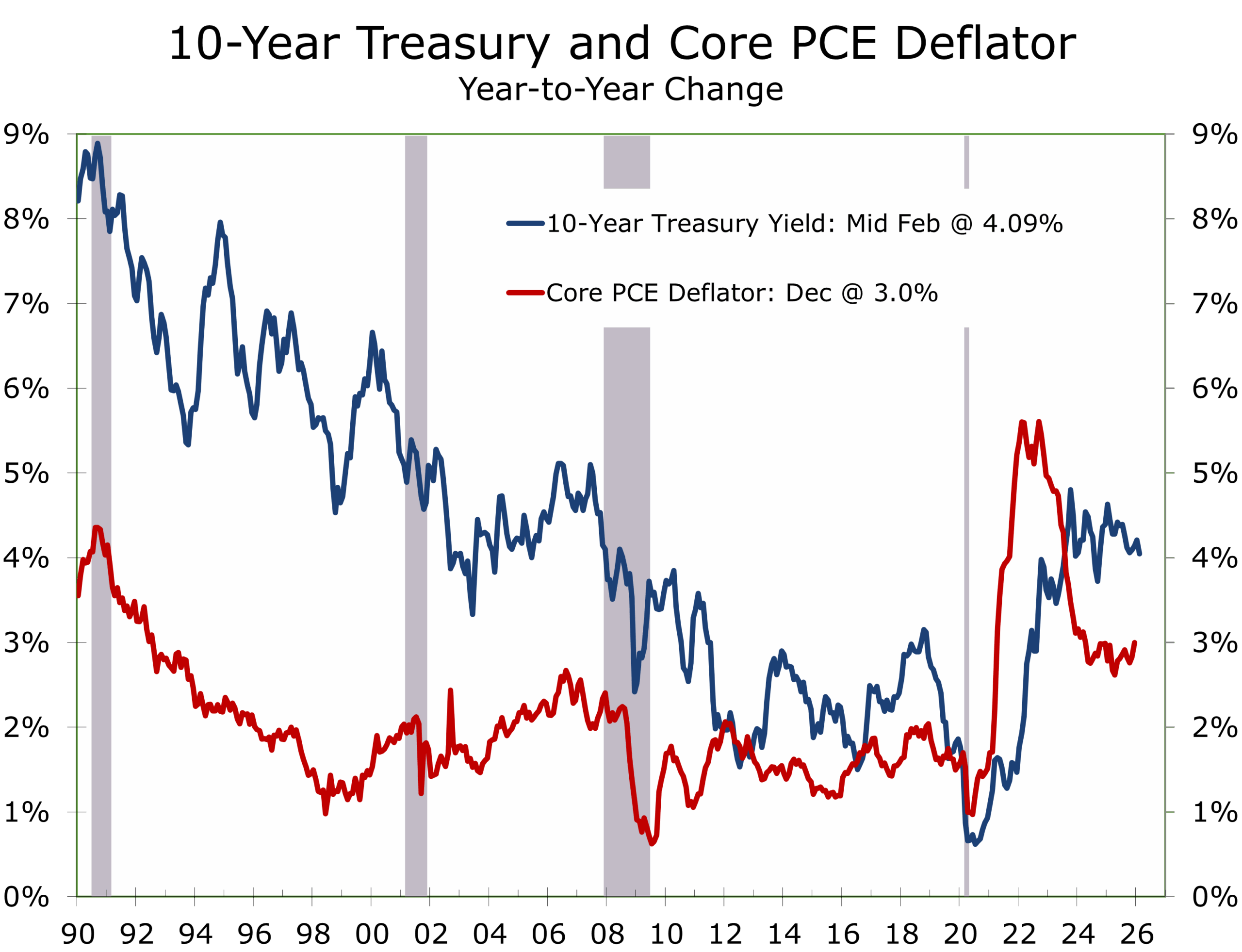 - Inflation continues to drifting lower. Accelerating productivity growth and decelerating shelter costs are driving the improving trend. Core measures cooled as the impact from tariffs fade and unit labor costs stabilize at a slower pace. Q4 saw a bit of an uptick, with the Gross Domestic Purchases price index rose 3.7% (up from 3.4% in Q3), PCE prices +2.9% (from 2.8%), but core PCE +2.7% (down from 2.9%).