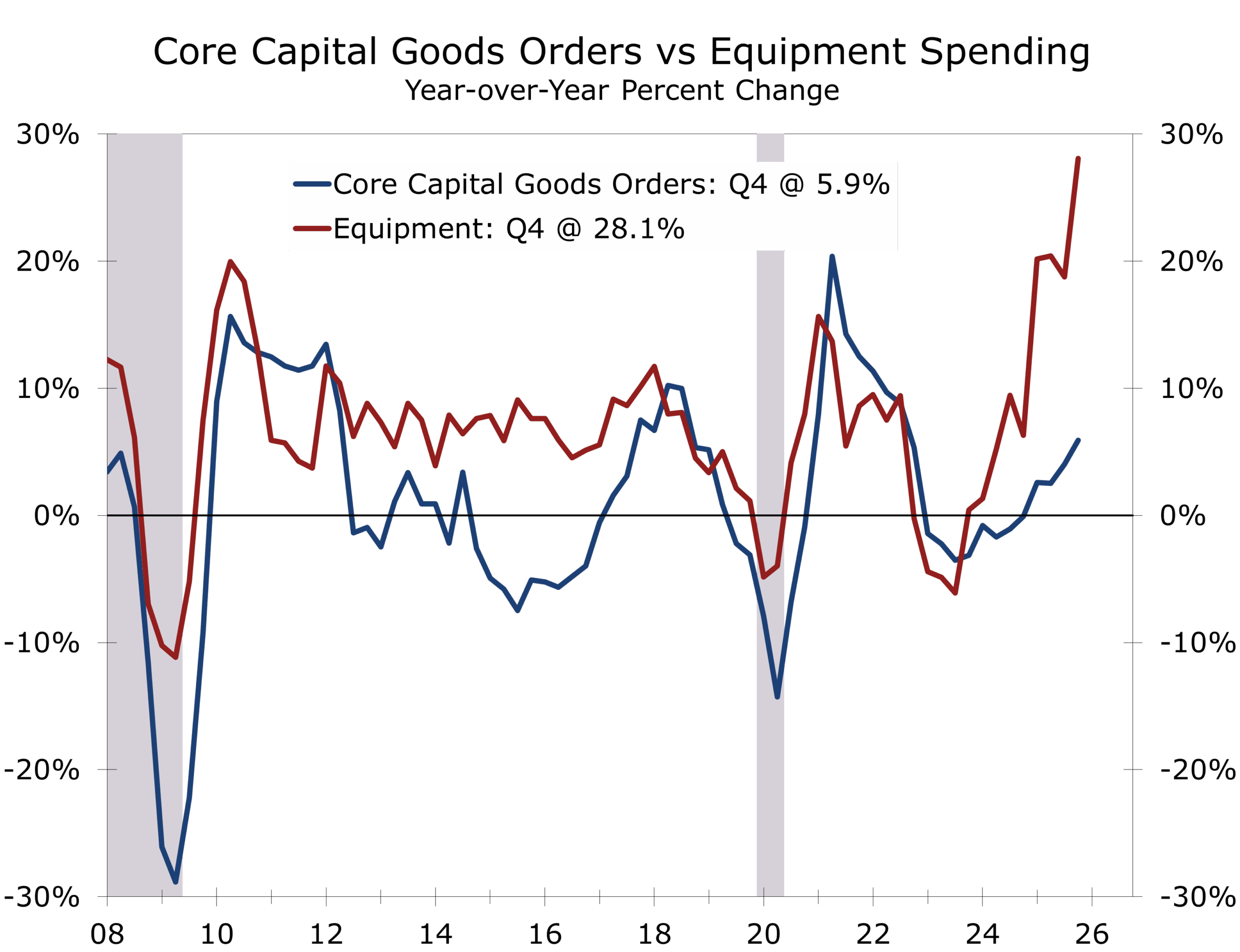 Wintertime data are unusually noisy. Utilities output surged while mining fell due to weather disruptions, distorting the industrial production headline. Strip out the volatility, however, and the factory sector is improving. Greater clarity around tariff policy, even if duties persist under alternative authorities, reduces one source of hesitation for manufacturers. We expect a cyclical recovery to take hold this year as supply chains normalize, inventories rebuild, and housing turnover stabilizes.
