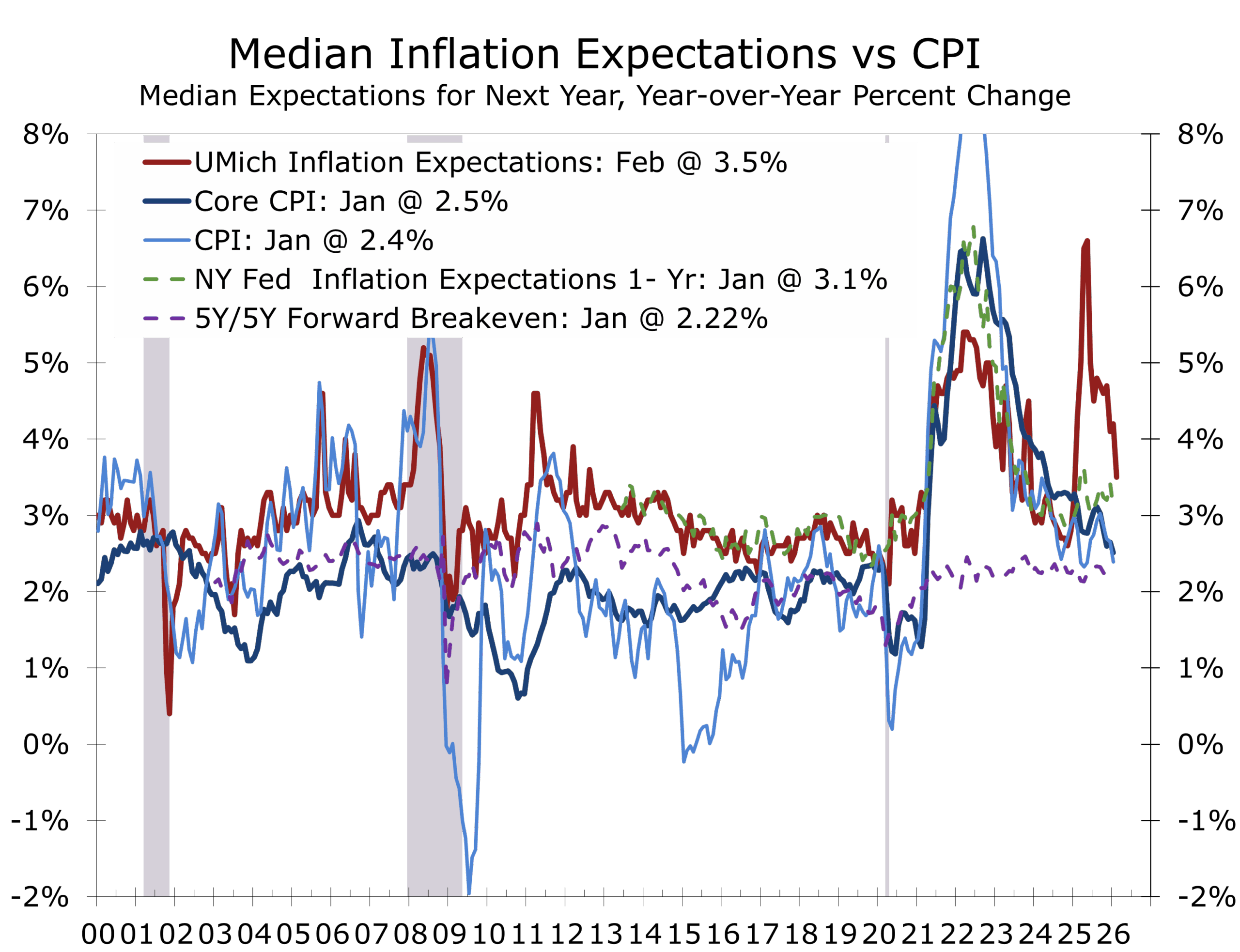 Inflation continues to ease, though the progress remains uneven. Slower job growth has restrained consumer spending, contributing to softer new and used vehicle sales and easing used car prices. Housing demand has similarly cooled, tempering home price appreciation, while a surge in apartment completions has generated rental concessions across much of the country, helping moderate shelter inflation. January CPI came in at 2.4% year over year on the headline and 2.5% on core, broadly in line with expectations and consistent with gradual disinflation. Inflation expectations have also eased.