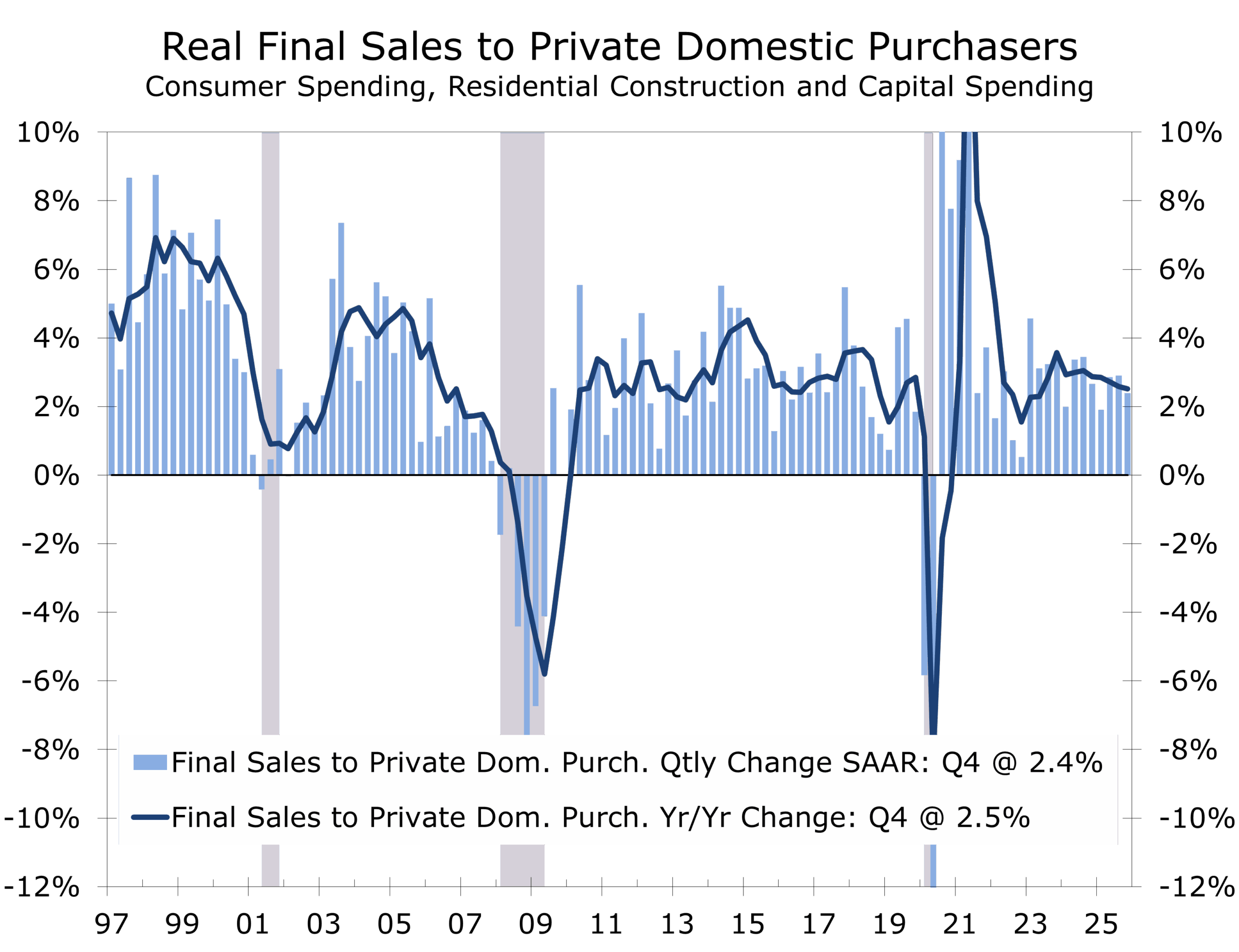- Q4 GDP resets expectations. Headline growth came in at a 1.4% annualized pace, well below the 3.0% consensus and our 2.8% call. Composition matters more than the headline: the shortfall stemmed largely from a larger-than-expected 1.2-percentage-point hit from the federal government shutdown. Private final domestic demand rose 2.4%, matching our estimate. Advance data put 2025 GDP growth at 2.2%, down from 2.8% in 2024; private final domestic demand grew 2.7% in 2025, down from 3.1% the prior year.