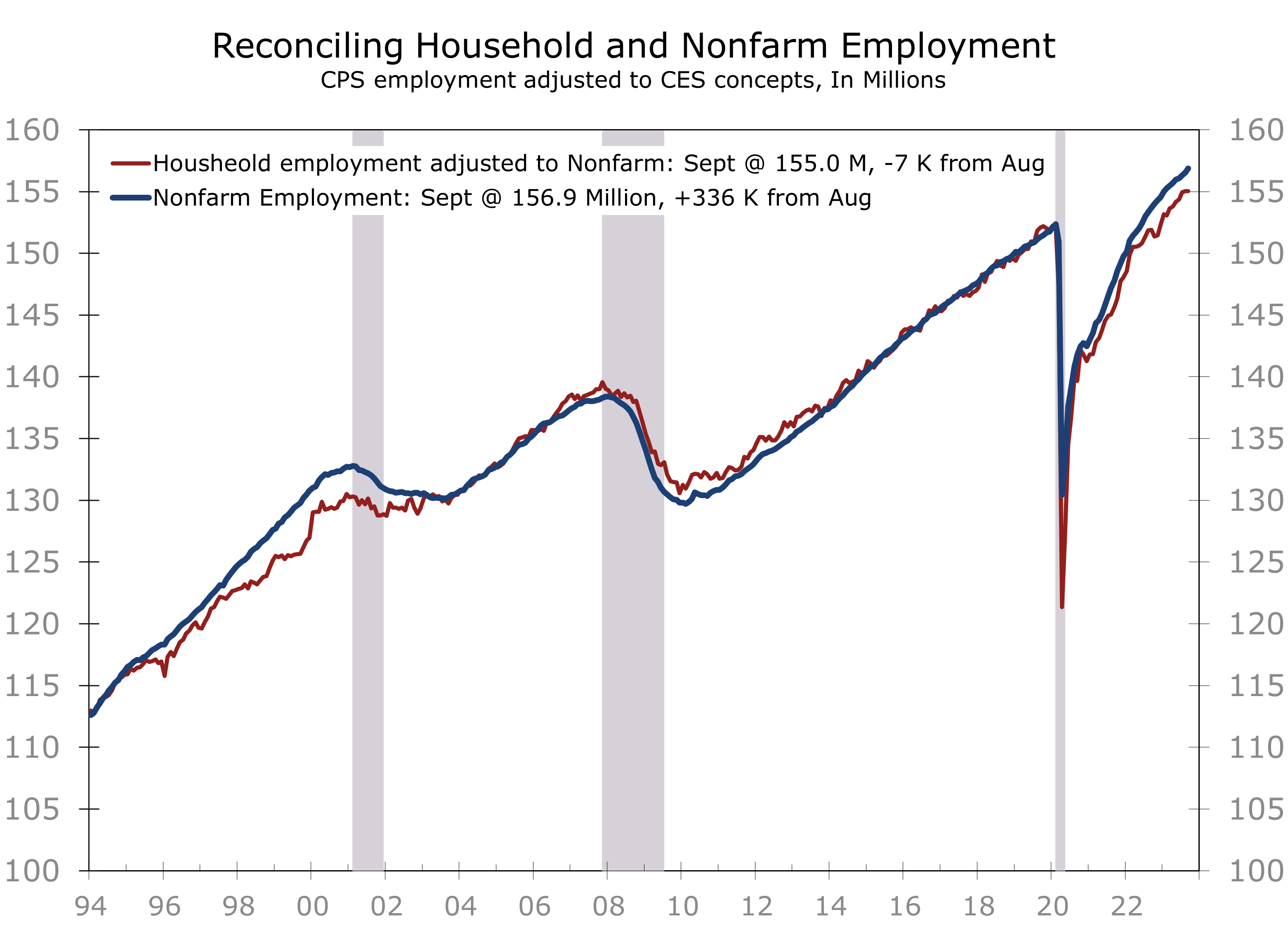 The adjusted household employment data show hiring has been more modest than has been reported by the nonfarm employment series. Moreover, adjusted household employment declined slightly in September. Once the nonfarm data are fully revised, the two series have generally tracked one another very closely. The bottom line is job growth has likely not been as strong as has been reported and is still losing momentum, despite the strong headline-grabbing September job gain reported in early October.