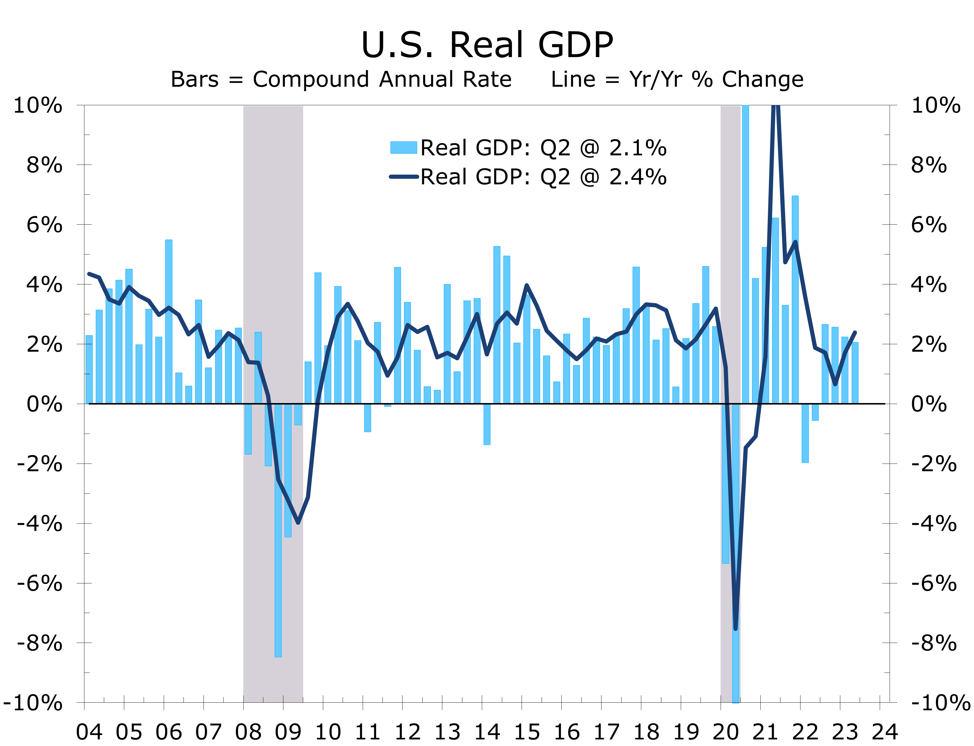 We doubt the Fed will hike interest rates any more this year unless a rate hike is already priced into the bond market. Yields have come down in the wake of comments from Fed officials discussing the uncertainty about whether the lags between interest rate increases and their impact on the economy have lengthened, or possibly even weakened, due to the preponderance of fixed-rate debt locked in by households and businesses when interest rates were near zero. That low fixed rate debt is what contributed to losses in the banking sector earlier this year and even at the Federal Reserve, which were a big part of the initial drag on Gross Domestic Income. Higher interest rates are transferring wealth from lenders, who are holding fixed-rate mortgages and mortgage-backed securities, to borrowers that locked in ultra-low rates. This transfer of wealth appears to be insulating a substantial share of households and businesses from higher interest rates.