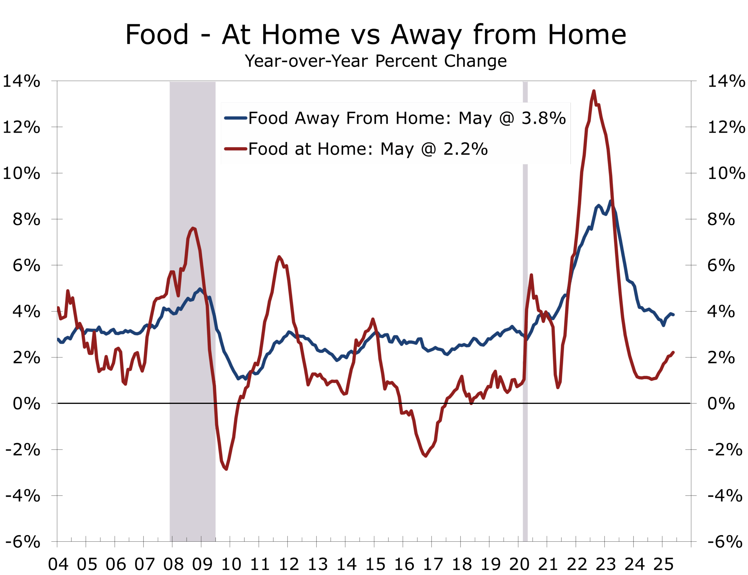Food prices rose 0.3% in May after a 0.1% dip in April. Grocery inflation was mixed: three of six major food-at-home categories rose, led by cereals and bakery products (+1.1%) and “other food at home” (+0.7%), while prices for meats, poultry, fish, and eggs fell 0.4%—driven by a 2.7% drop in egg prices. Restaurant inflation remained steady, with both full-service and limited-service meals up 0.3%. On a year-over-year basis, prices at the grocery store are up 2.2%, while the costs of dining out continues to rise faster, climbing 3.8%.