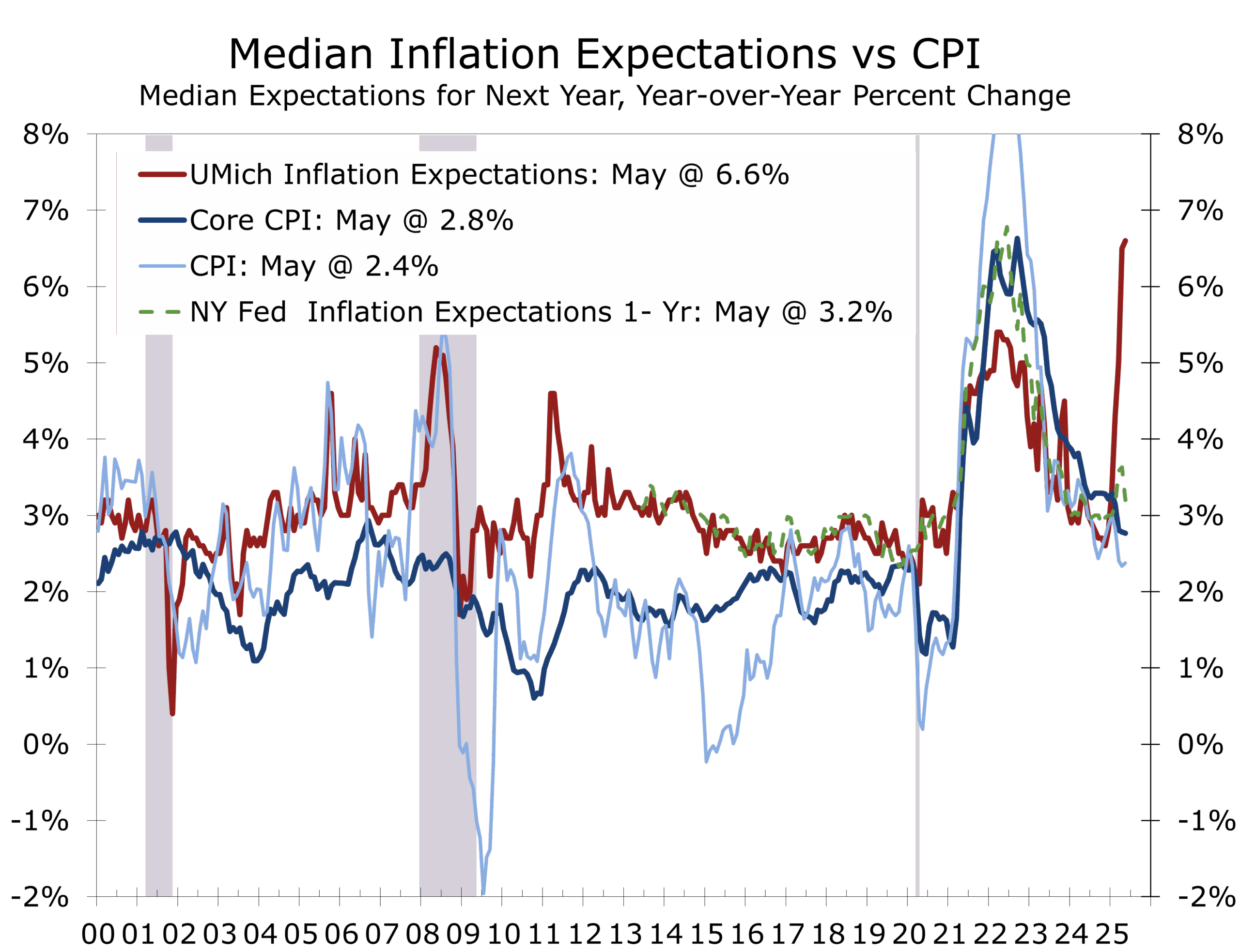 Moderating prices for groceries and gasoline are helping to offset tariff-related pressures. Energy prices fell 1.0% in May, driven by a 2.6% decline in gasoline. West Texas Intermediate crude briefly dropped to $60 per barrel last month but has since rebounded on rising Mideast tensions. As such, the relief from lower gas prices seen this spring may fade this summer.