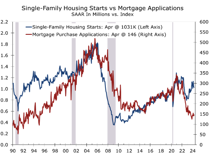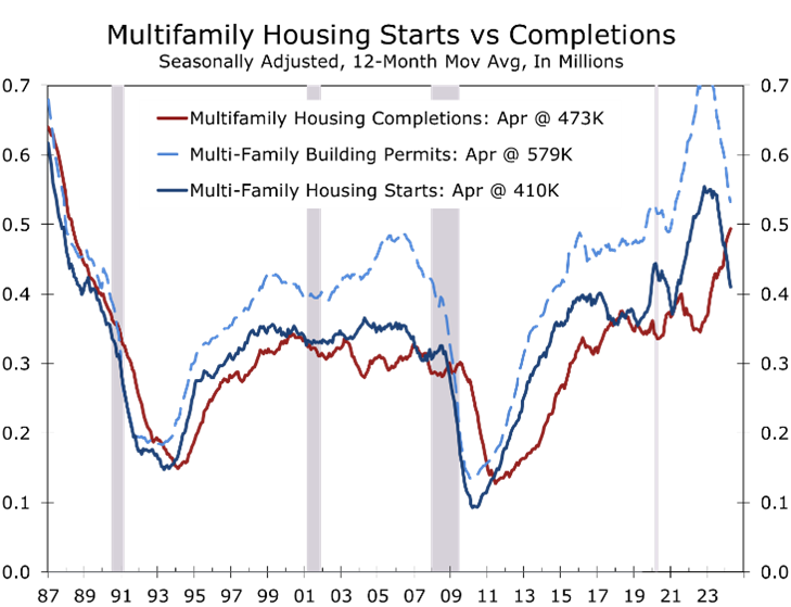 The monthly housing data have been harder to read recently. Builder optimism surged late last year on renewed hopes for lower interest rates following the Fed’s December FOMC meeting. This optimism primarily impacted the single-family market, prompting a jump in starts during a typically slow seasonal period. A string of stronger economic reports earlier this year, however, led to renewed uncertainty about the timing and extent of any interest rate cuts, leading builders to adopt a more cautious approach.