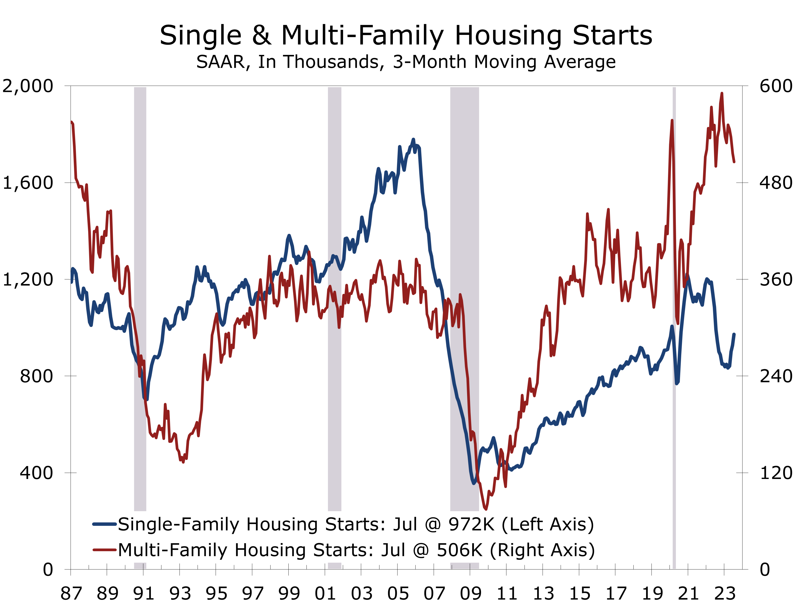 - Housing starts rose 3.9% to a 1.452-million-unit pace in July. Sales in June were revised lower, while sales in May were revised slightly higher. On net, starts are roughly 1.3% ahead of where they were initially reported to be for June.