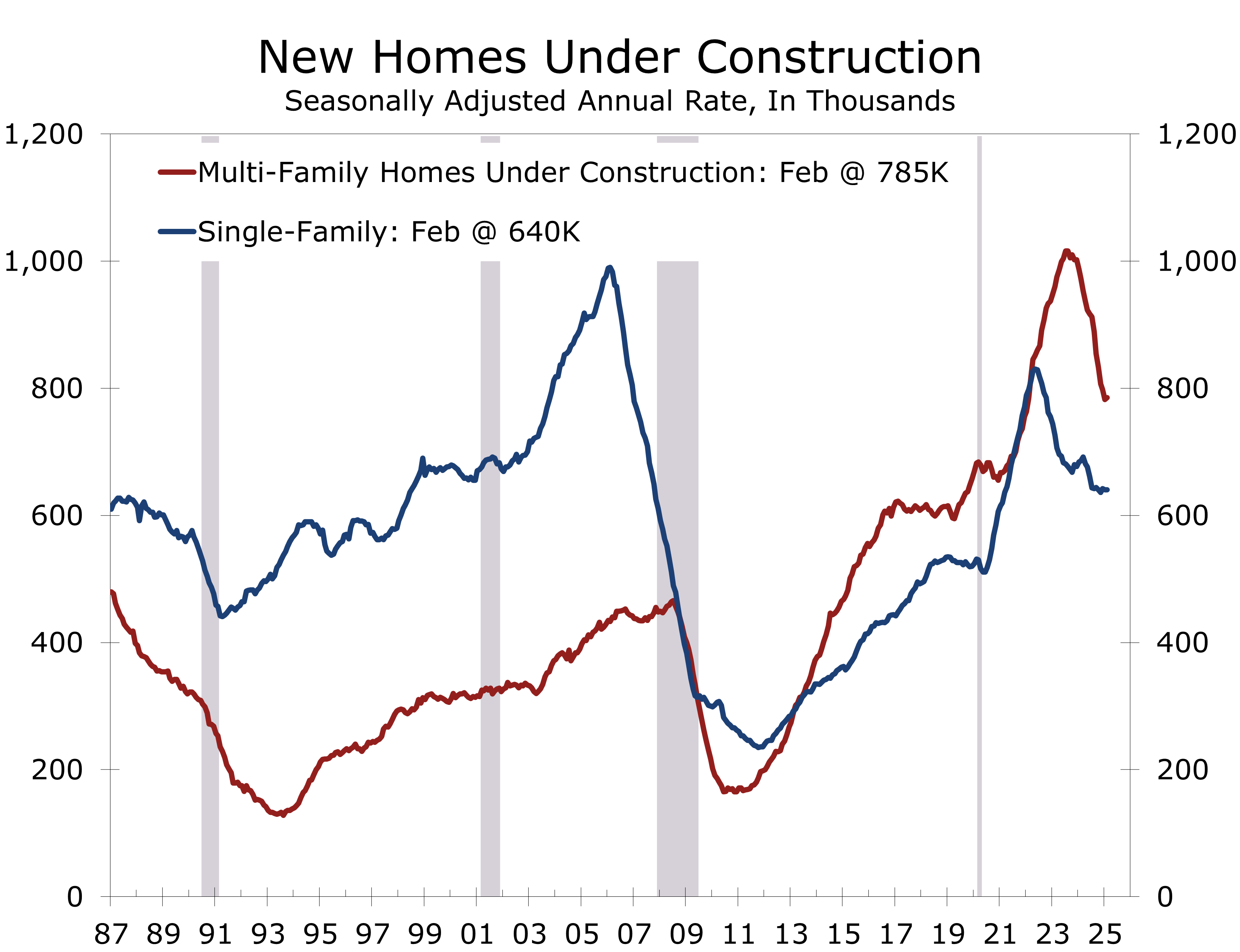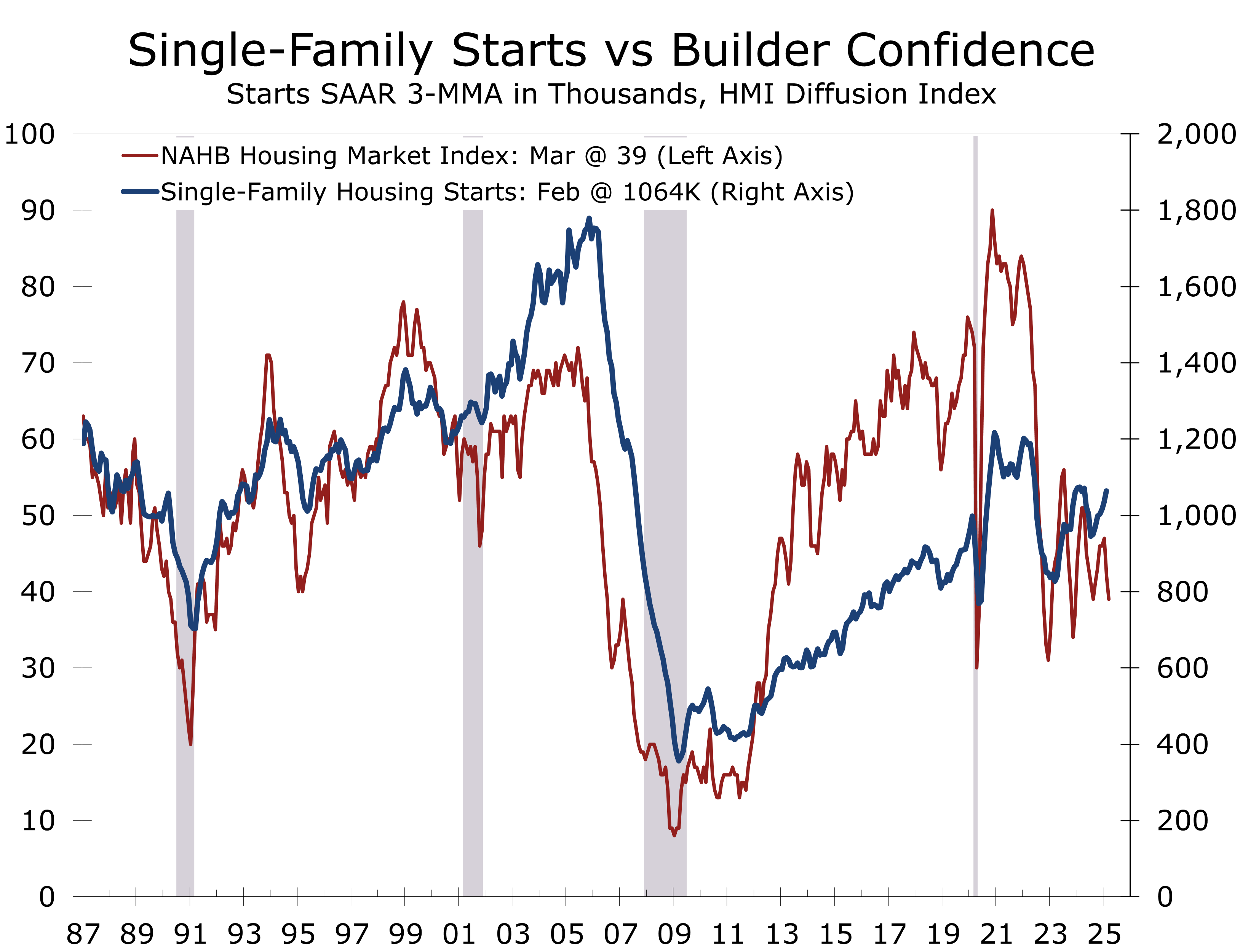 Builder sentiment, as measured by the National Association of Home Builders (NAHB)/Wells Fargo Housing Market Index (HMI), fell to 39 in March—its lowest since August 2024. Homebuilders cited potentially higher input costs from tariffs and worsening labor shortages tied to immigration policies under President Trump. Despite a 40-basis-point decline in mortgage rates since January, builders noted growing buyer caution and weaker prospective buyer traffic. Prospective buyer traffic tumbled 5 points in March to 24, its lowest level in 15 months.