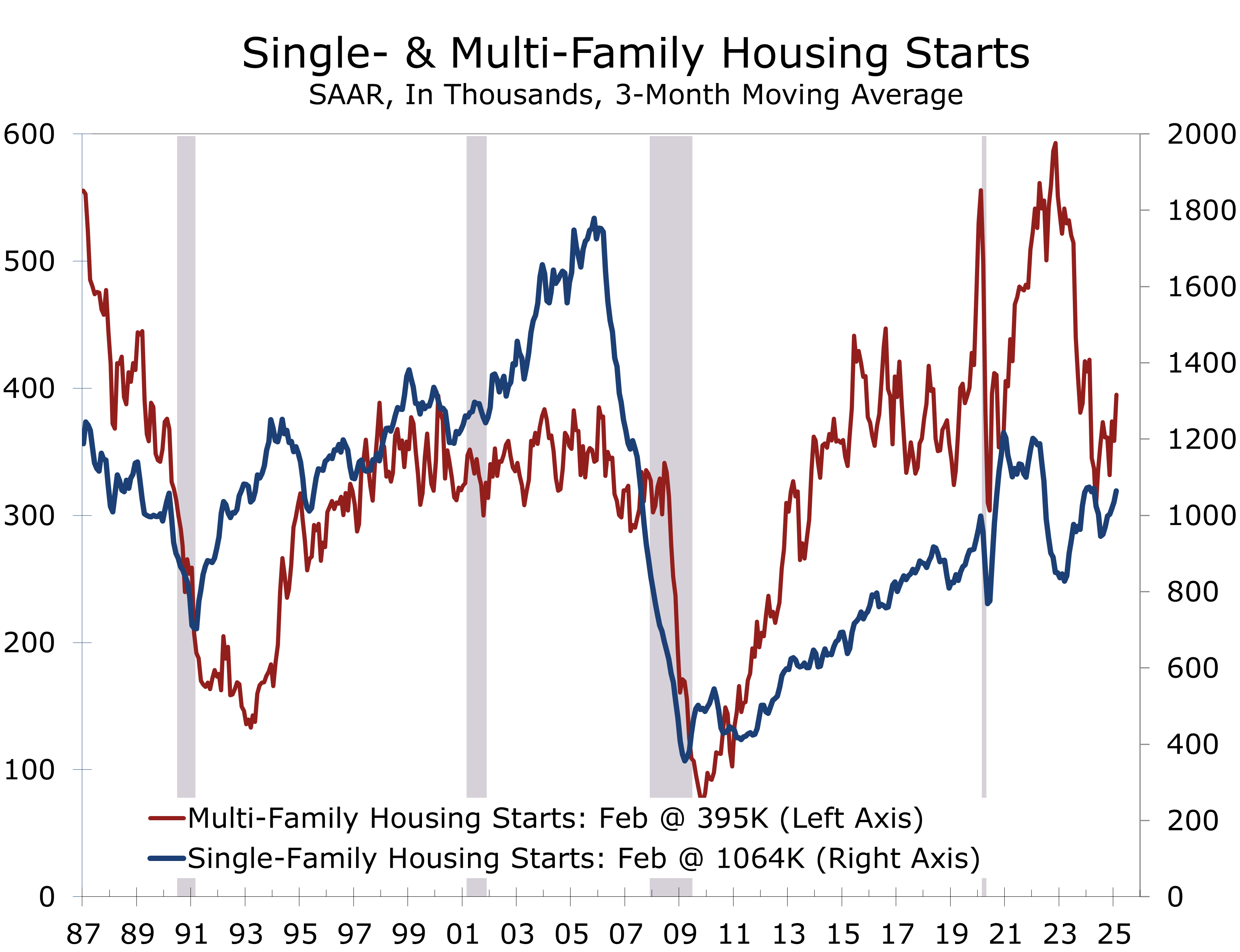 Home building rebounded in February, with housing starts surging 11.2% to a 1.51 million unit seasonally adjusted annual rate (SAAR). This increase exceeded expectations for a modest rebound following January’s weather-related slowdown. Building permits—which tend to lead starts by 1 to 2 months and are less influenced by weather distortions—dipped 1.2% to a 1.456 million-unit pace. While the stronger February housing starts data is a rare bit of good news, we doubt it reflects a momentum shift for the sector, which faces persistent headwinds from tariffs, labor shortages, and sagging consumer sentiment.