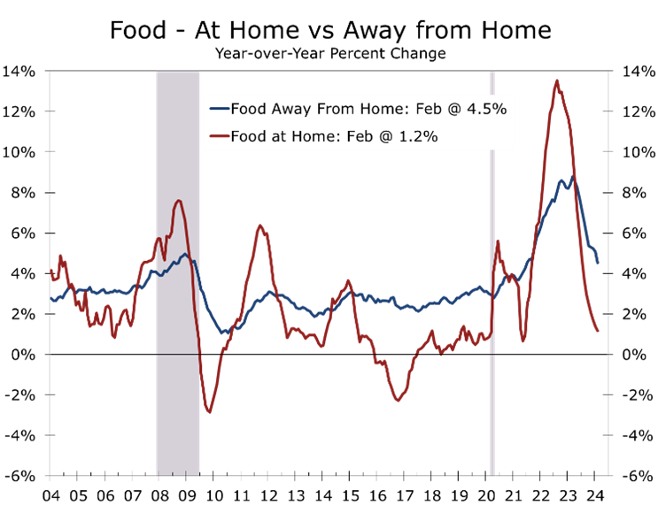 One clear bright spot in the February data is that food prices are rising less rapidly. Prices remained unchanged at grocery store, following a 0.4% increase in January. Prices at restaurants rose just 0.1%, compared to a 0.5% increase in January.