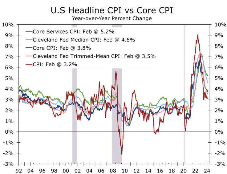 Inflation once again exceeded expectations in February, with the CPI rising 0.4% and prices excluding food and energy also rising 0.4%. Despite the disappointing report, price increases were slightly less widespread than in January and show signs of moderating. However, the pace of moderation is slower than what financial markets had anticipated, leading many forecasters to push the Fed’s first rate cut out to June, a position we have held for some time.