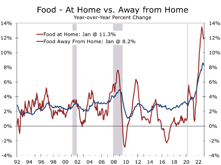 Food prices most likely head the list of consumers’ frustration today. Prices for food at home, which is mostly groceries, have spiked 11.3% over the past year. Eggs are the greatest source of pain, with prices surging 8.5% in January and 70.1% over the past year. Prices for many other food items, including meats (0.0%), pork (0.0%), poultry (-0.1%) and fish (-0.1%) all moderated in January, continuing recent trends.