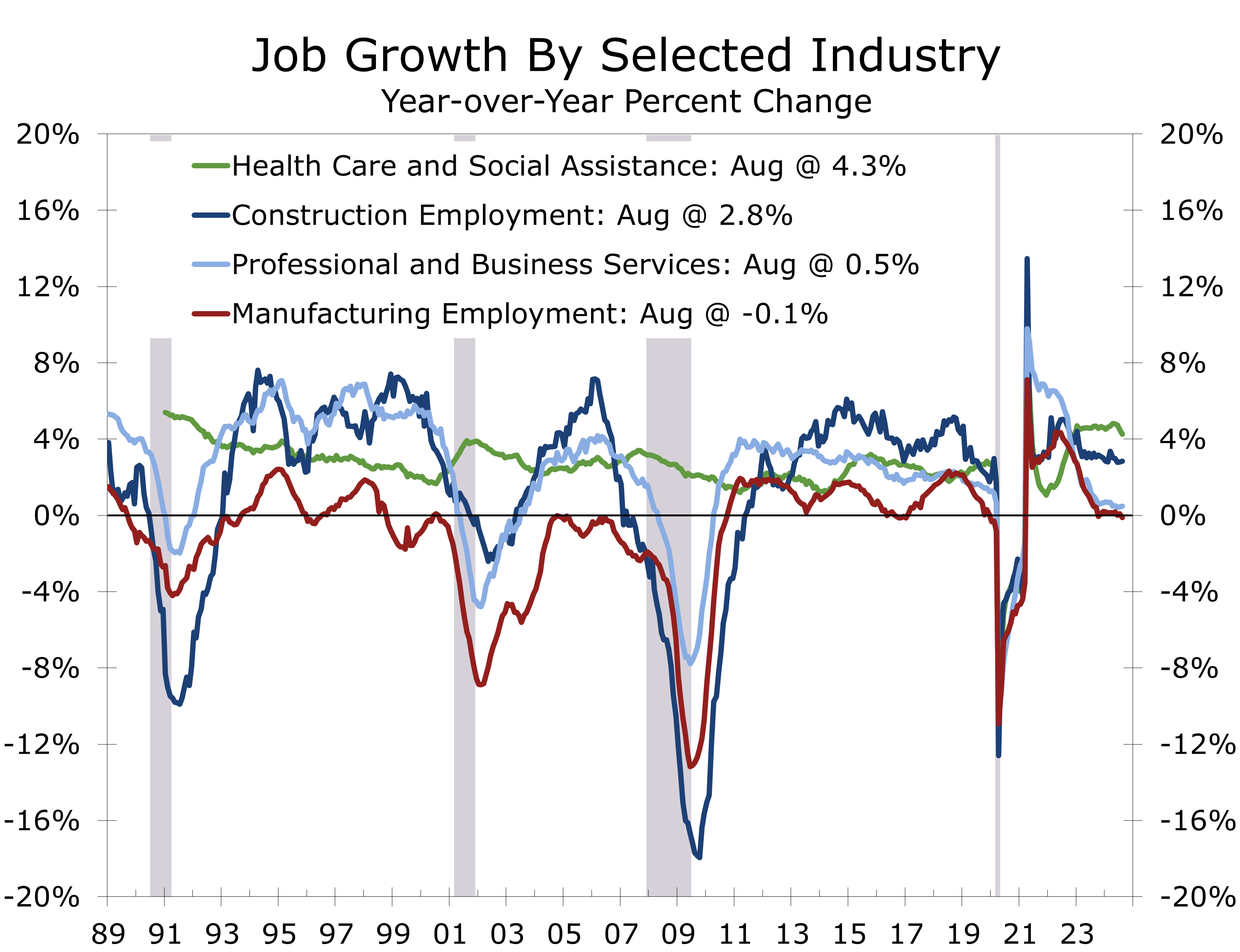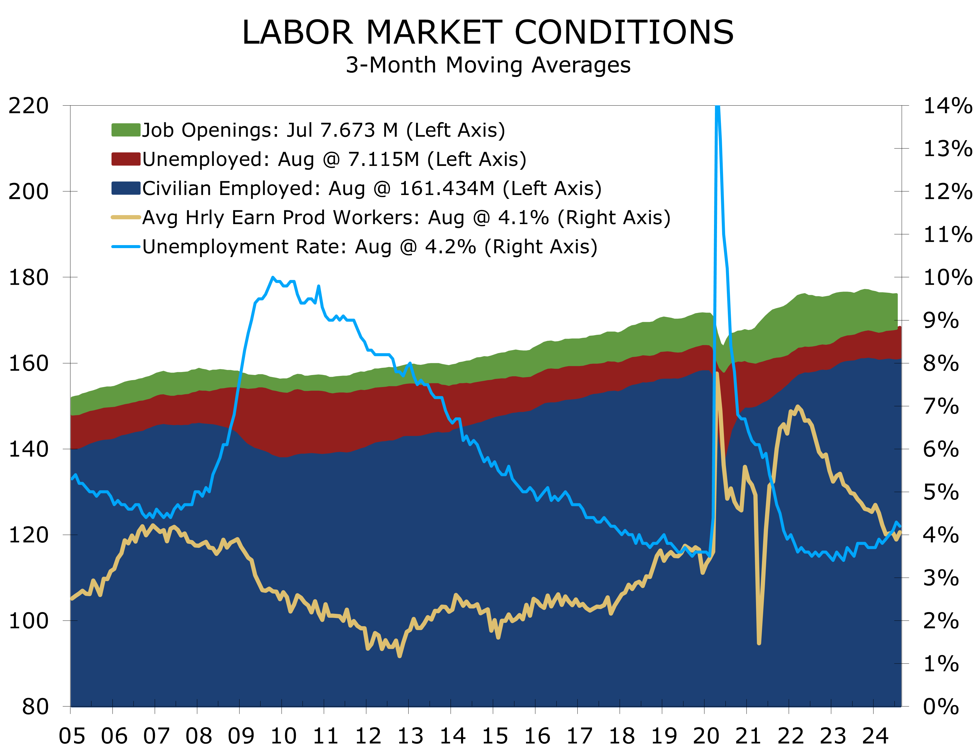 While professional employment has weakened, job growth remains strong in many trades. Construction added 34,000 jobs in August, surpassing the 12-month average of 19,000. Heavy and civil engineering contributed 14,000 jobs, as did nonresidential specialty trade contractors, reflecting the buildout driven by various fiscal initiatives. By contrast, residential construction job growth appears to be slowing, as the apartment boom winds down.