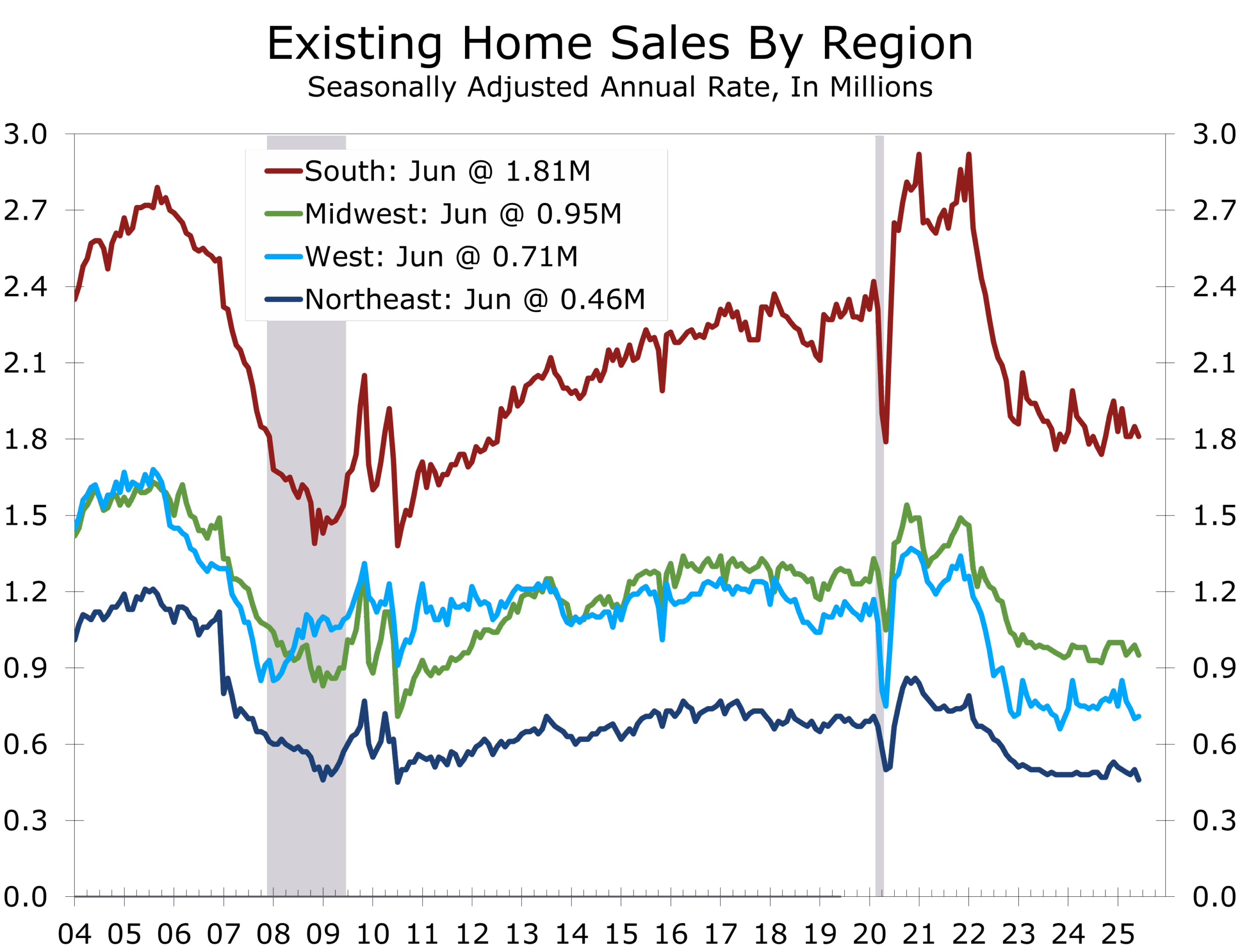 Existing home sales fell 2.7% in June to a 3.93 million unit annualized pace, disappointing consensus and underscoring the persistent paralysis in housing. Sales were flat versus a year ago, but structural cracks are widening. High borrowing costs, anemic affordable supply, and declining participation continue to weigh on turnover.