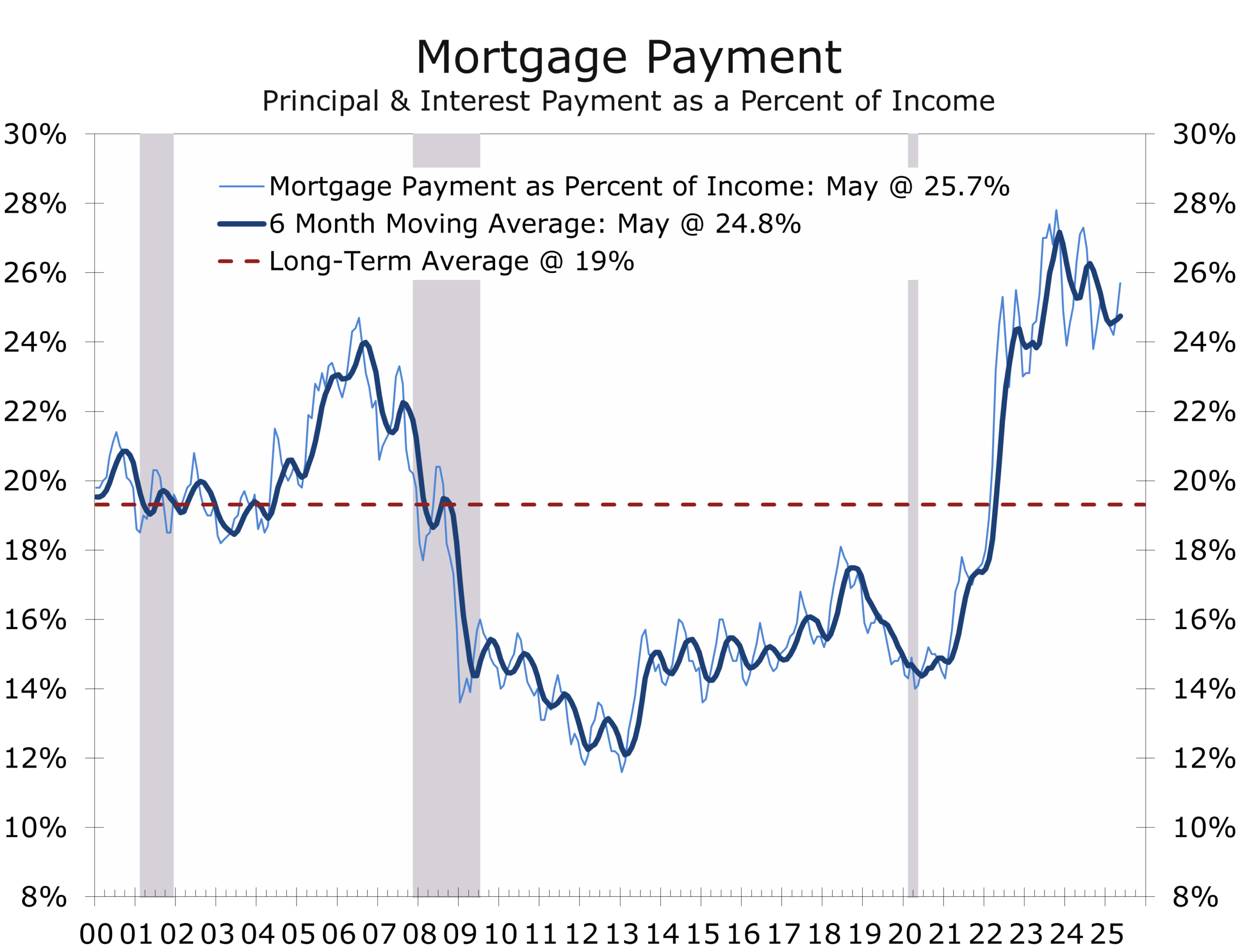 June’s weak sales underscore housing’s role as a growing policy bottleneck. For a median-income household putting 10% down on a median-priced home, principal and interest now consume over 25% of income—well above historical norms. With turnover frozen, lower rates are not translating into broader economic momentum. A drop toward 6% could spur some demand, but structural constraints run deeper.