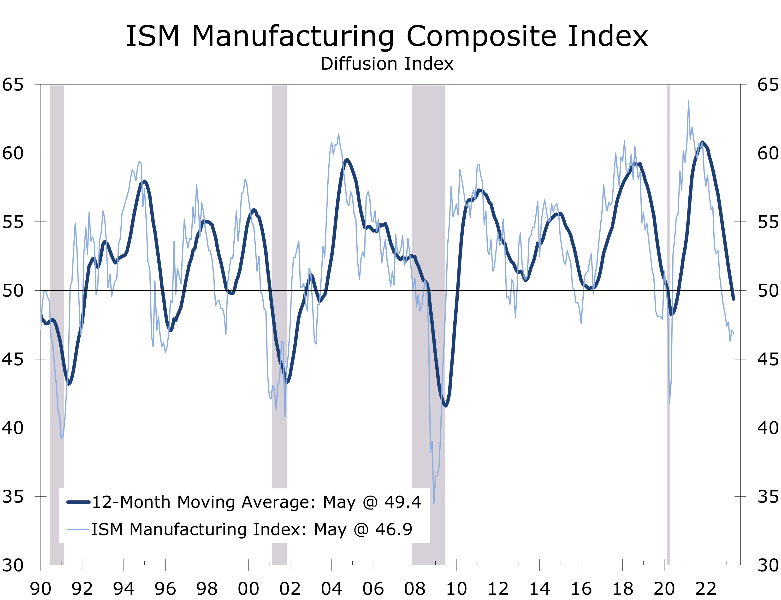 - The ISM Manufacturing Index fell 0.2 points to 46.9 in May, marking its sixth consecutive month in contraction territory.