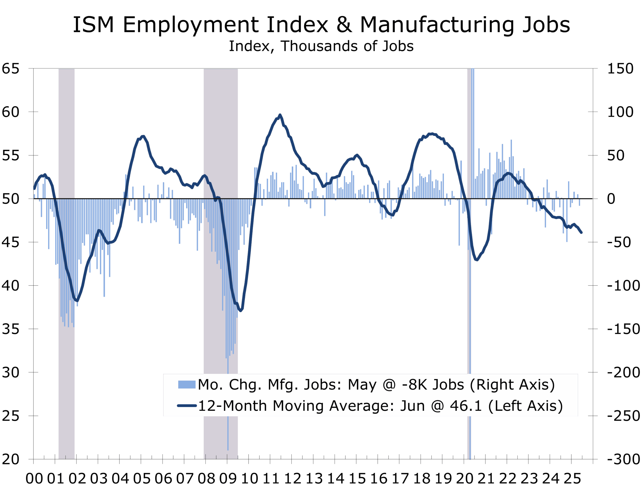 The June report confirms that manufacturing remains in a cautious holding pattern. Businesses are navigating a complex mix of excruciating slowly fading tariff threats, resurfacing cost pressures, and lackluster demand. That triple squeeze is forcing firms to cut costs, delay hiring, and tighten capex plans.