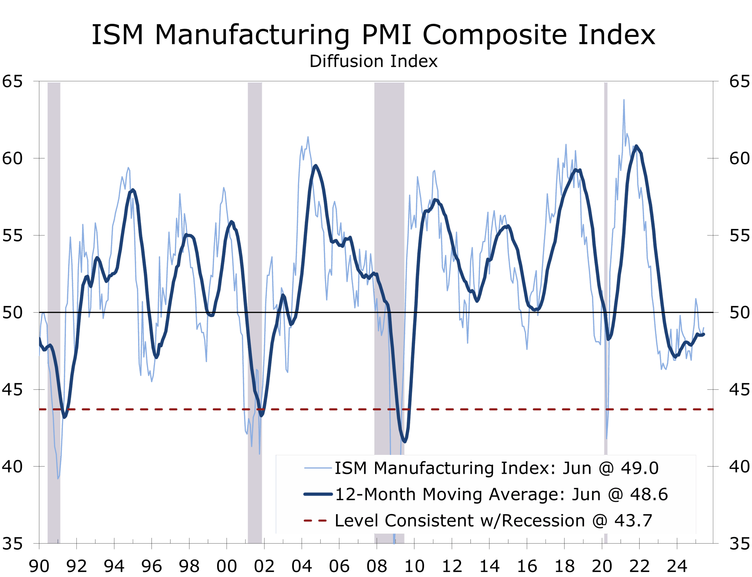 As we expected, the ISM Manufacturing Index remained just below the key 50-breakeven level in June, rising to 49.0 from 48.5 in May. As a diffusion index, the ISM measures the breadth of change rather than magnitude—so while more firms reported weakening conditions than improving, the reading remains well above the 43.7 mark that historically signals a broad-based recession.