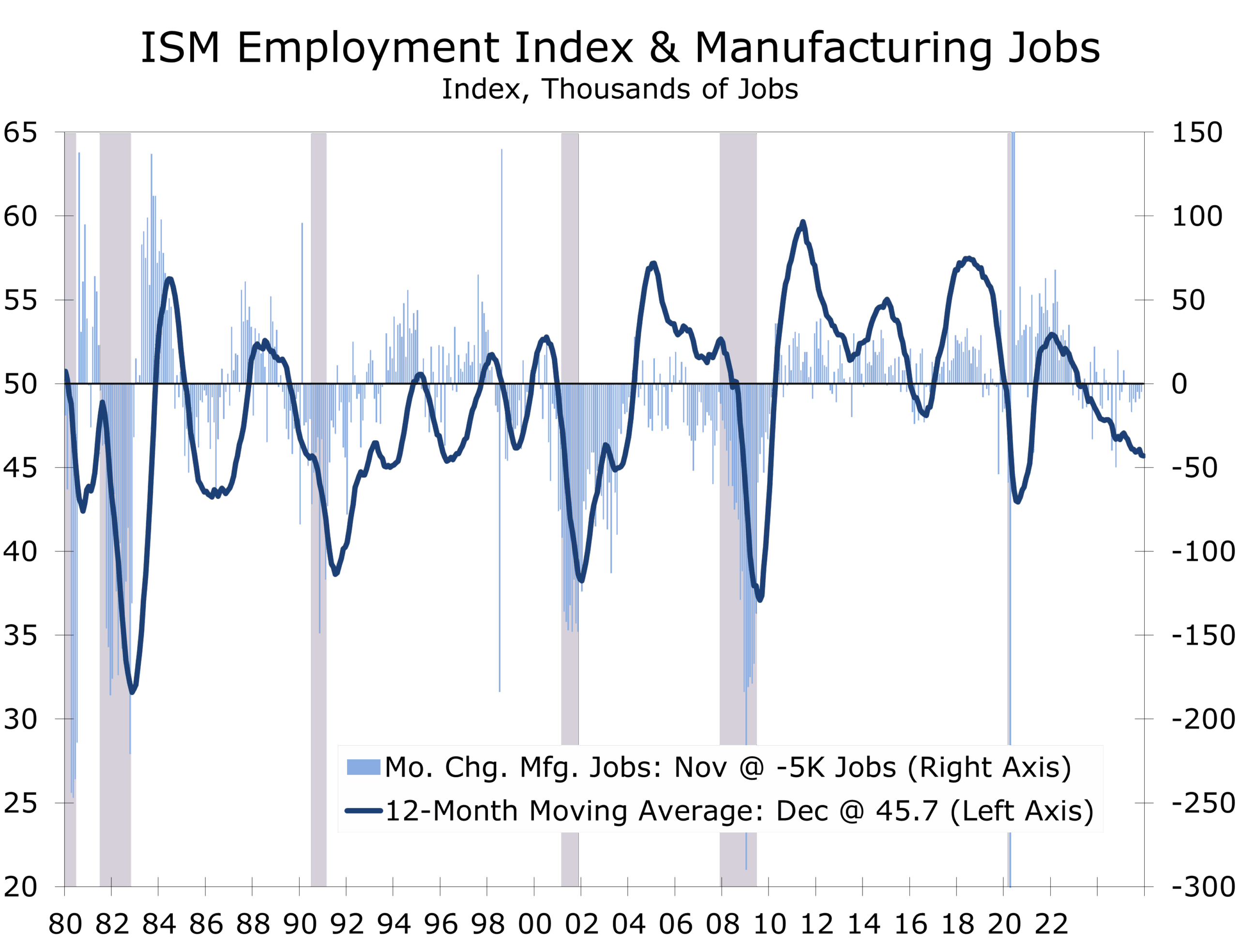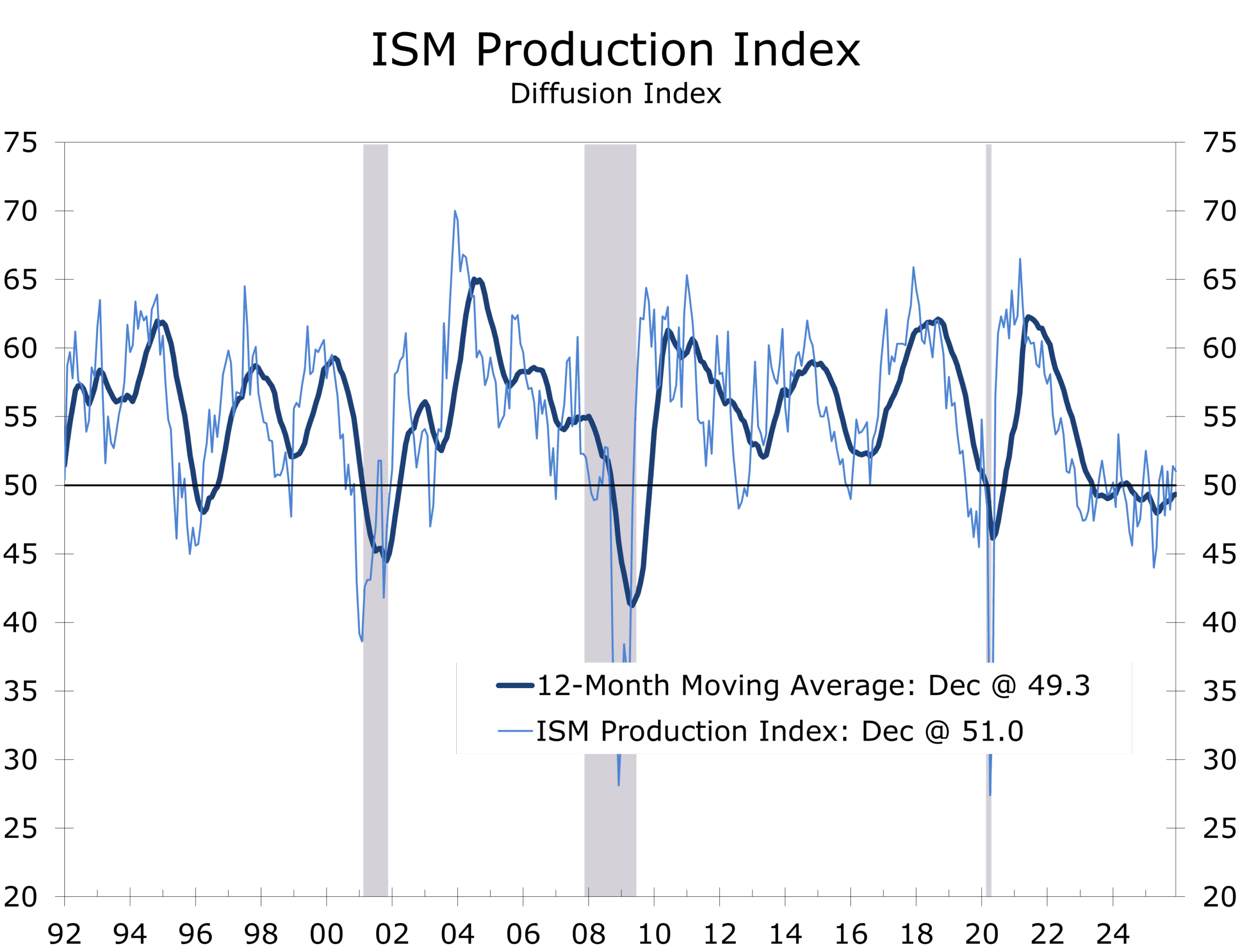 The ISM Manufacturing PMI® slipped to 47.9 in December, the lowest reading of 2025 and the sector’s tenth consecutive month in contraction. As with prior months, the sub-50 reading reflects the breadth of softness, not a collapse in activity. Manufacturing remains a drag on overall growth, but the level of the PMI is still consistent with continued overall economic expansion, reinforcing our view that the U.S. economy is moving through a long adjustment phase, or policy reset, rather than a cyclical downturn.