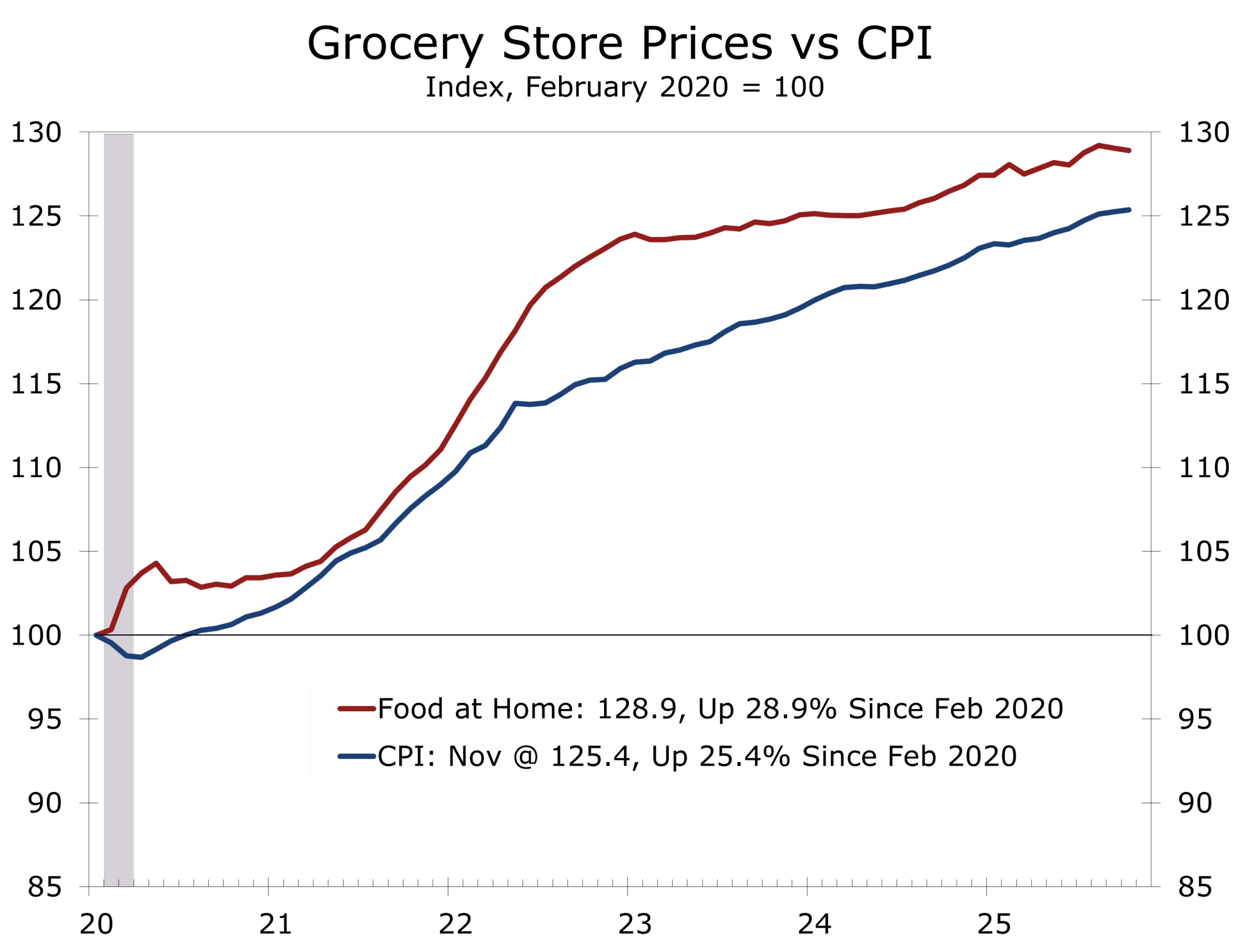 - Data caveat: October CPI data were not collected due to the federal government shutdown, compressing two months of inflation into a single report.