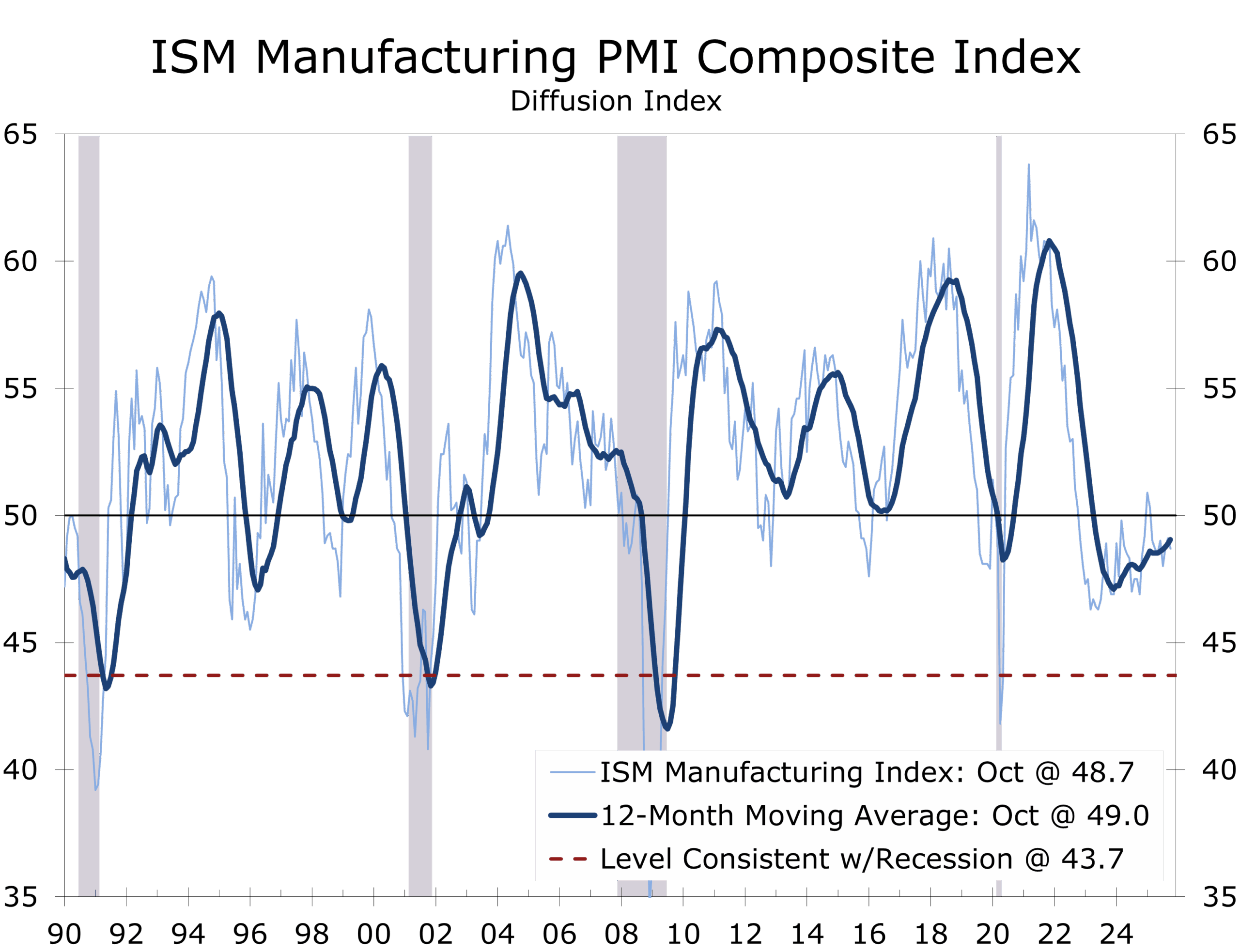 The ISM Manufacturing PMI® registered 48.7 in October, down 0.4 points from September, marking the eighth consecutive month of contraction following a brief reprieve earlier this year. As a diffusion index, readings below 50 mean that more firms report worsening rather than improving conditions — a measure of breadth, not magnitude.