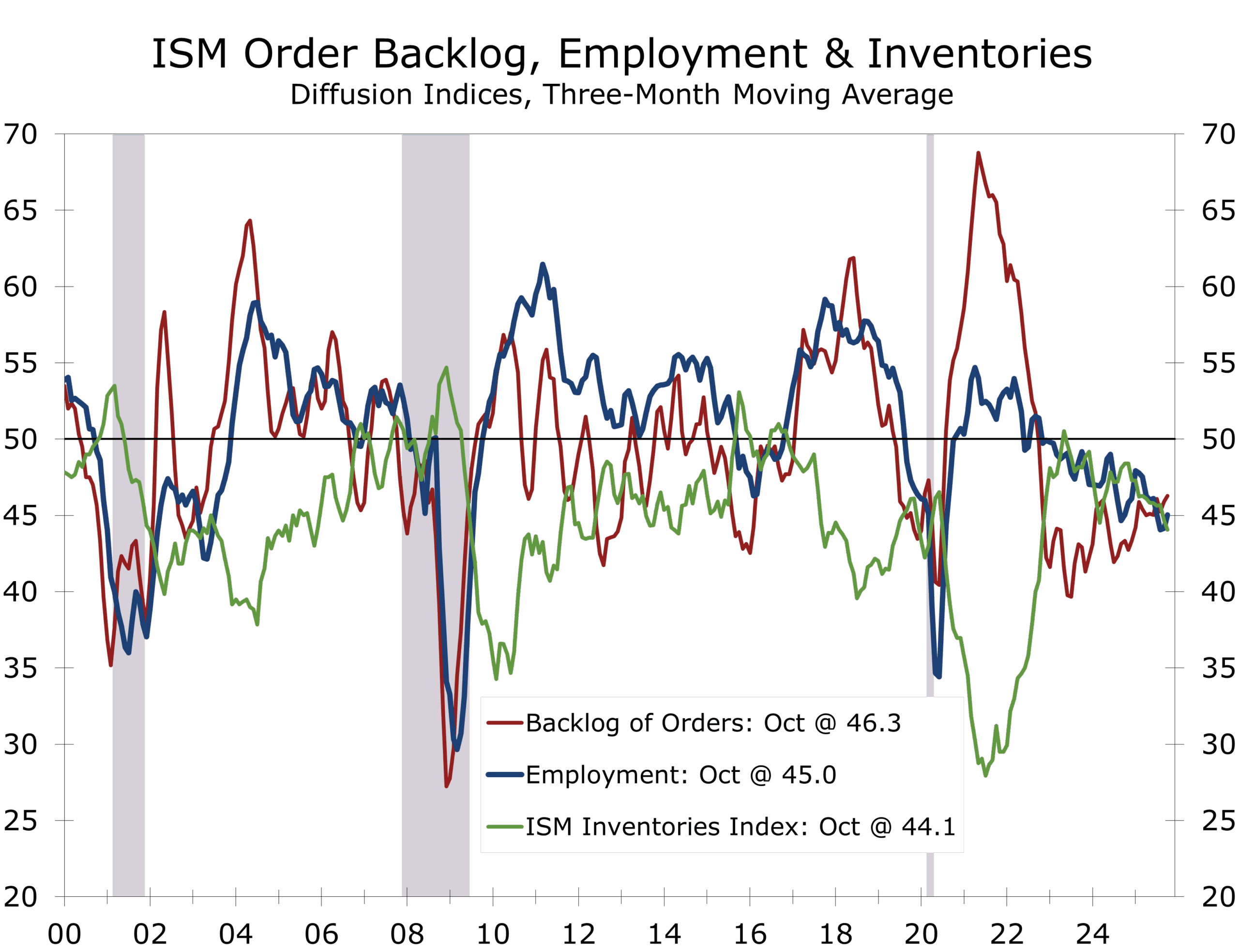- Supplier Deliveries: 54.2 (+1.6) — slower deliveries for a third month, consistent with stabilized but subdued activity.