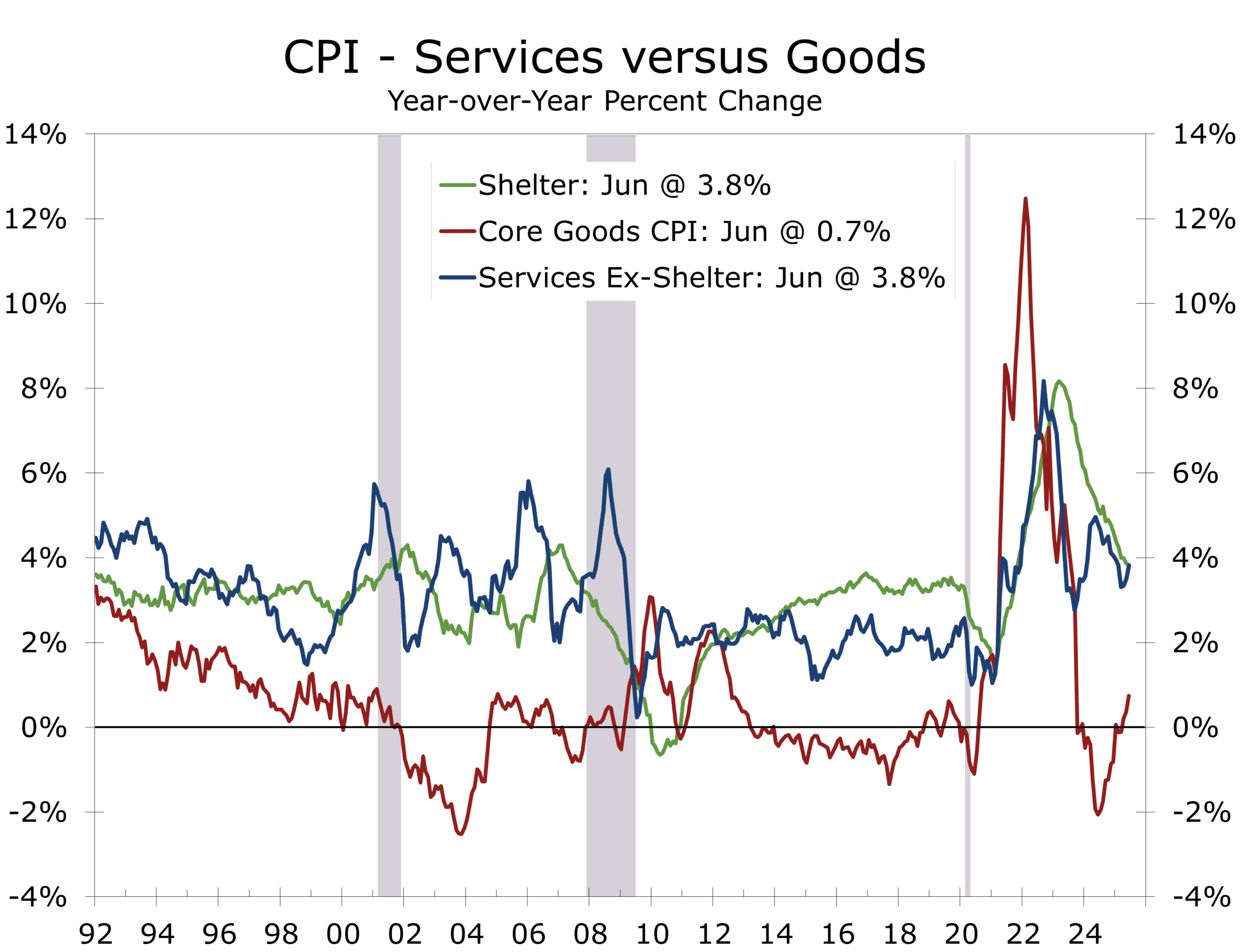 Year-over-year, headline CPI rose to 2.7% and core to 2.9%. With base effects fading, inflationary momentum remains subdued—especially in categories that previously drove price spikes. Most encouragingly, core services outside of housing have shown sustained improvement over several months.