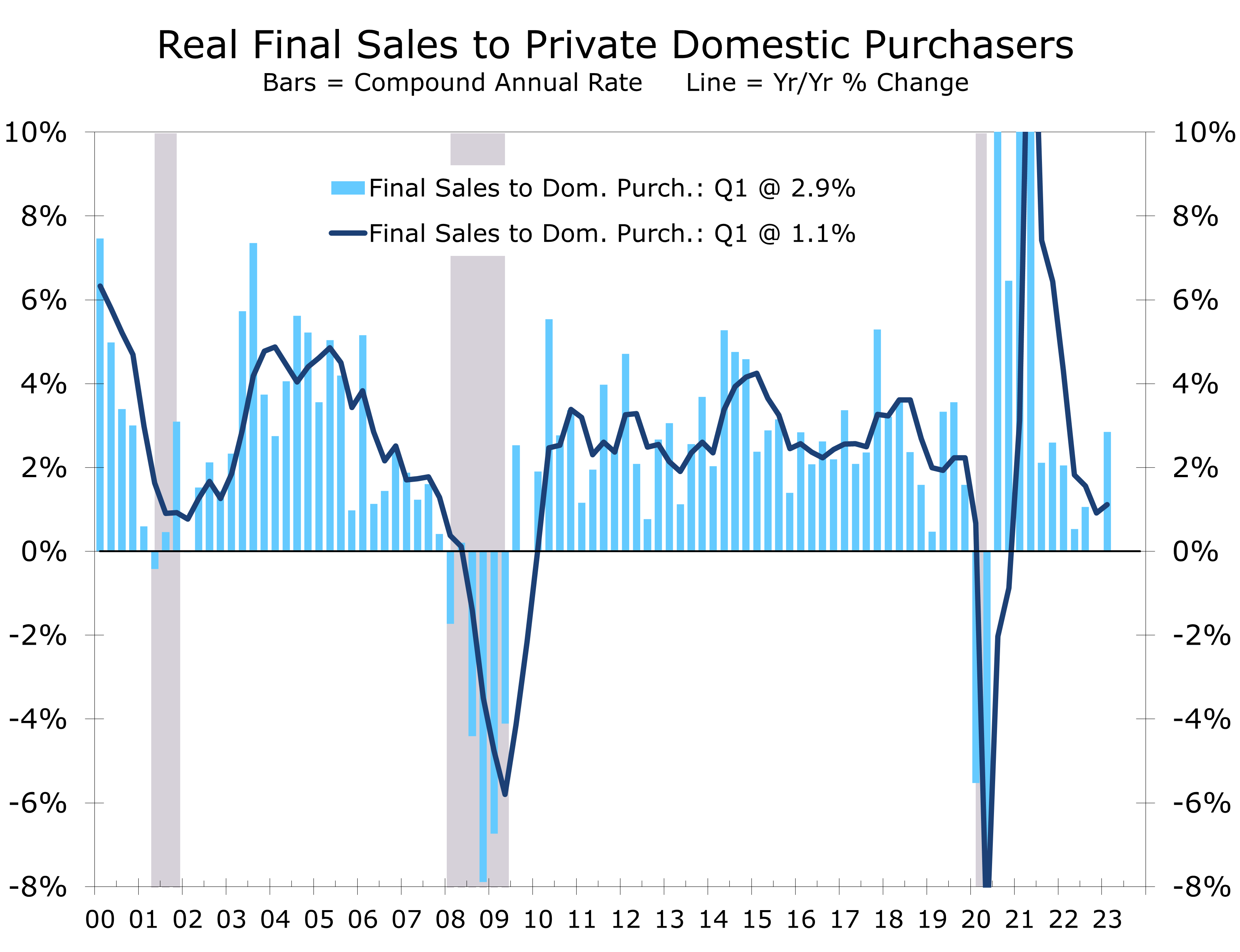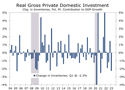 The underlying details of first quarter GDP were generally more positive. The large drawdown in inventories sliced 2.3 percentage points off overall growth. Inventories have been unusually volatile since the pandemic began. Much of the reduction in Q1 occurred at wholesalers and manufacturers. Real final sales to private domestic purchasers, which is our preferred measure of final demand, rose at a 2.9% annual rate in Q1 and is now up just 1.4% year-to-year.