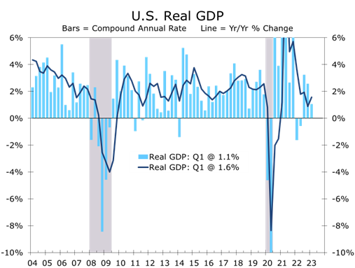 - Real GDP rose at a 1.1% annual rate, coming in a full percentage point below our forecast.