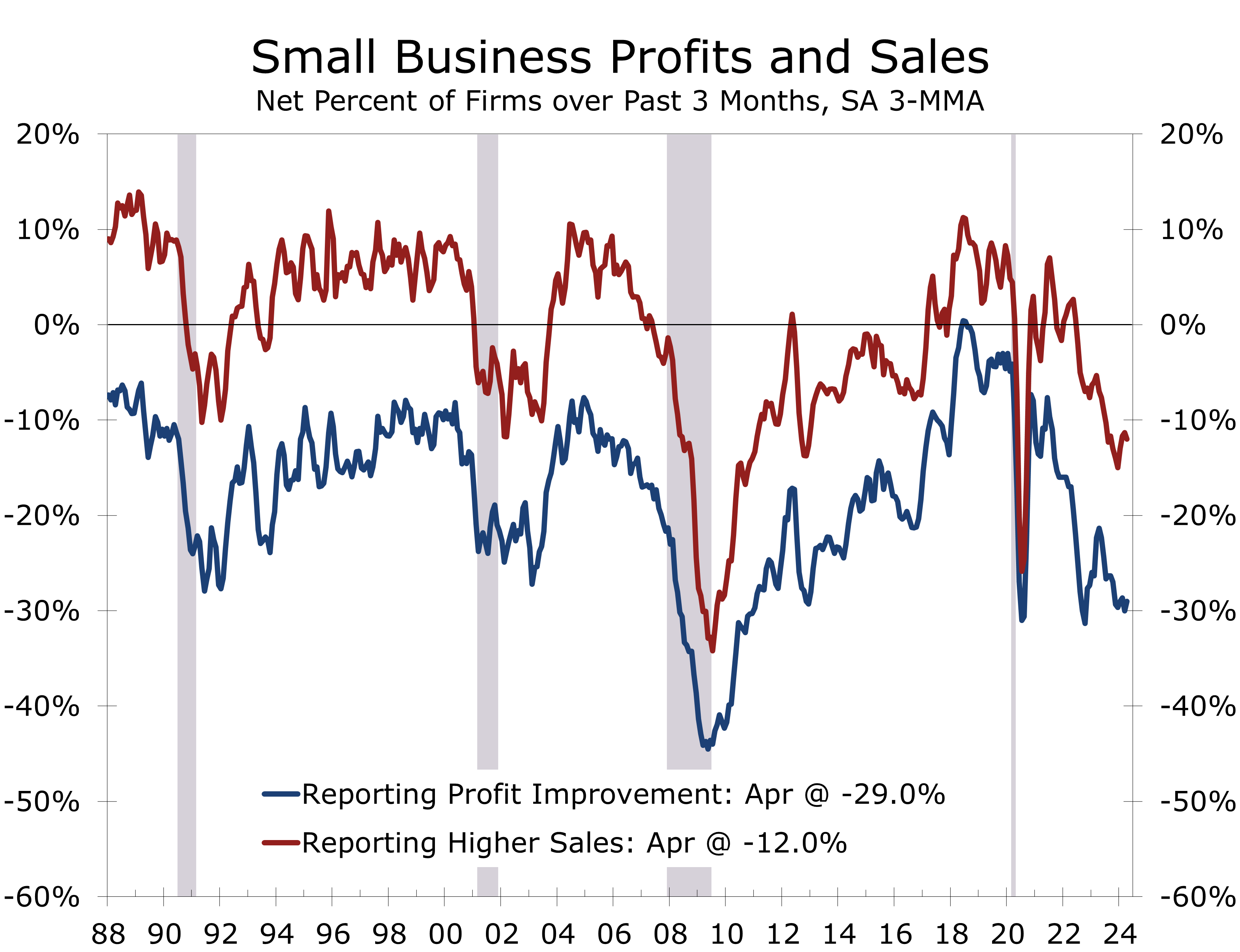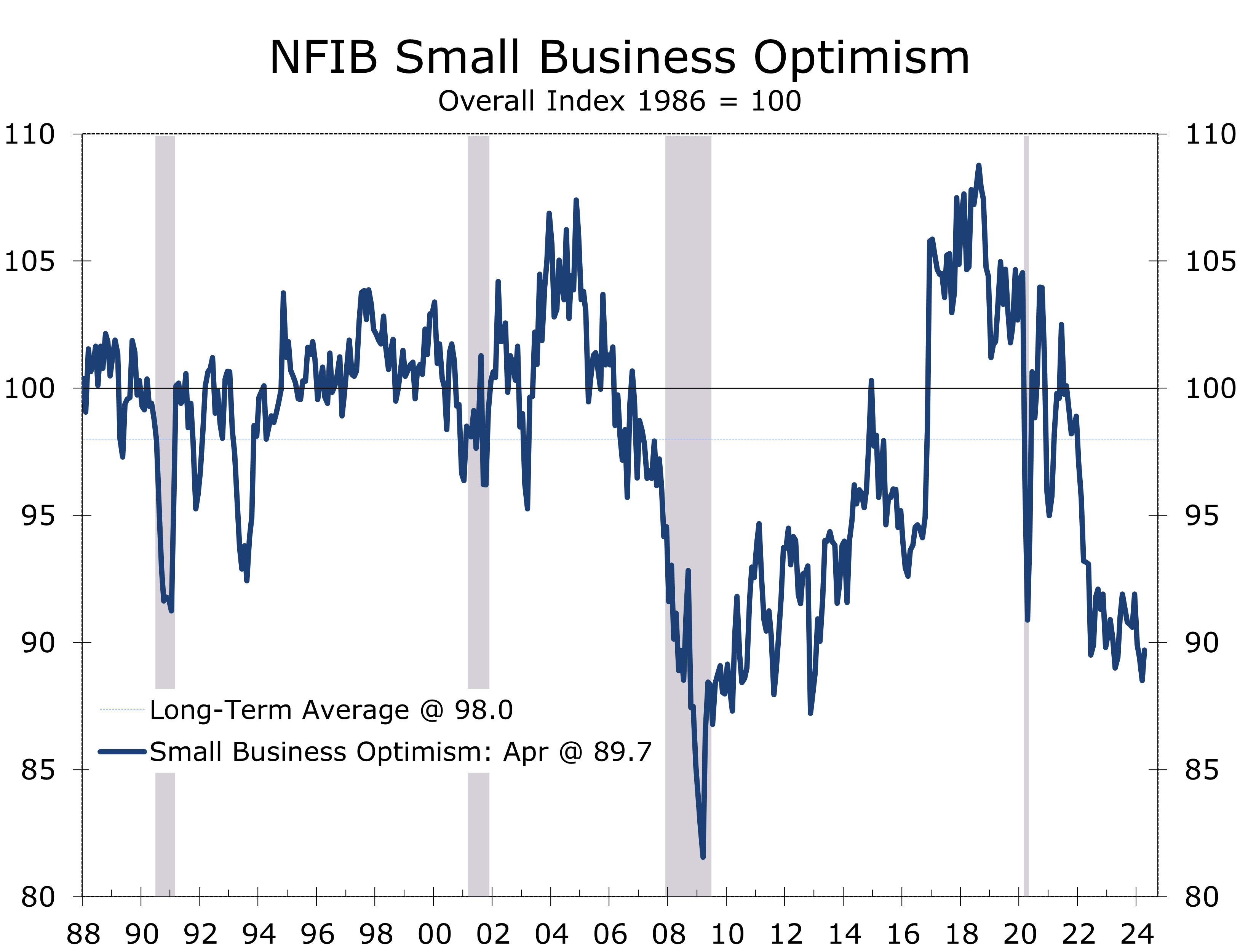 Small business optimism improved slightly in April, rising 1.2 points to 89.9. This marked the first increase this year and left the index close to its post-pandemic lows. Small Business Optimism has averaged 90.6 for the past 2 years, well below its long-run average of 98.