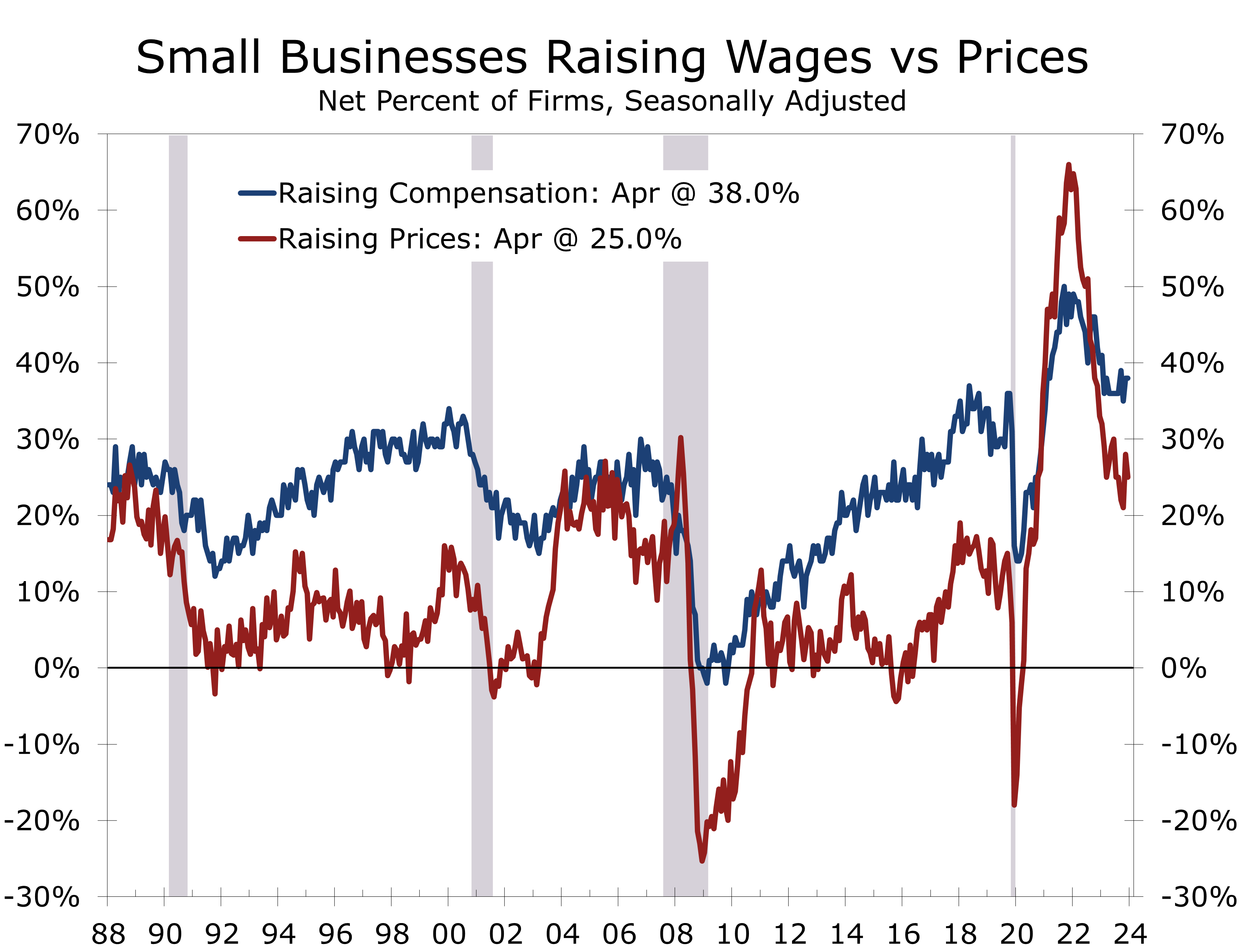 - Despite the squeeze on operating margins, the share of business owners planning to raise prices fell 7 points in April to 26%.