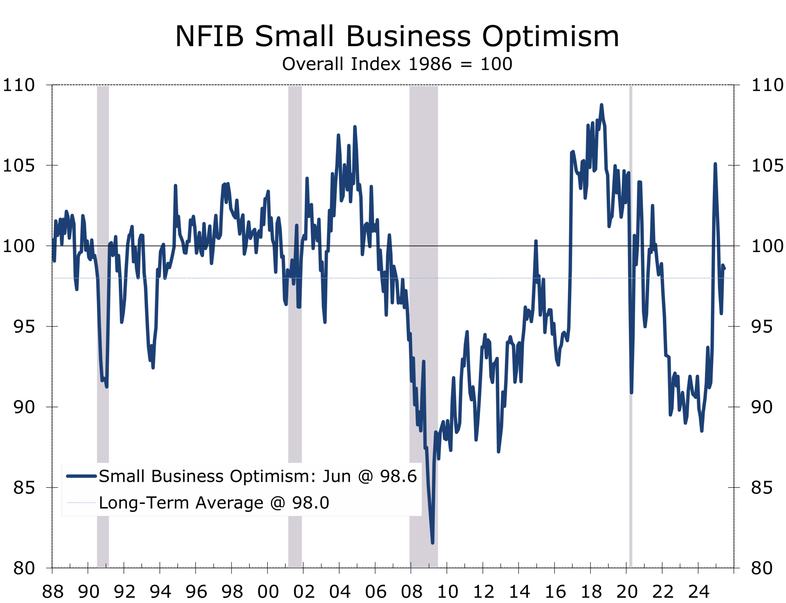 - The NFIB Small Business Optimism Index ticked down 0.2 points to 98.6 in June, still slightly above the 51-year average of 98.