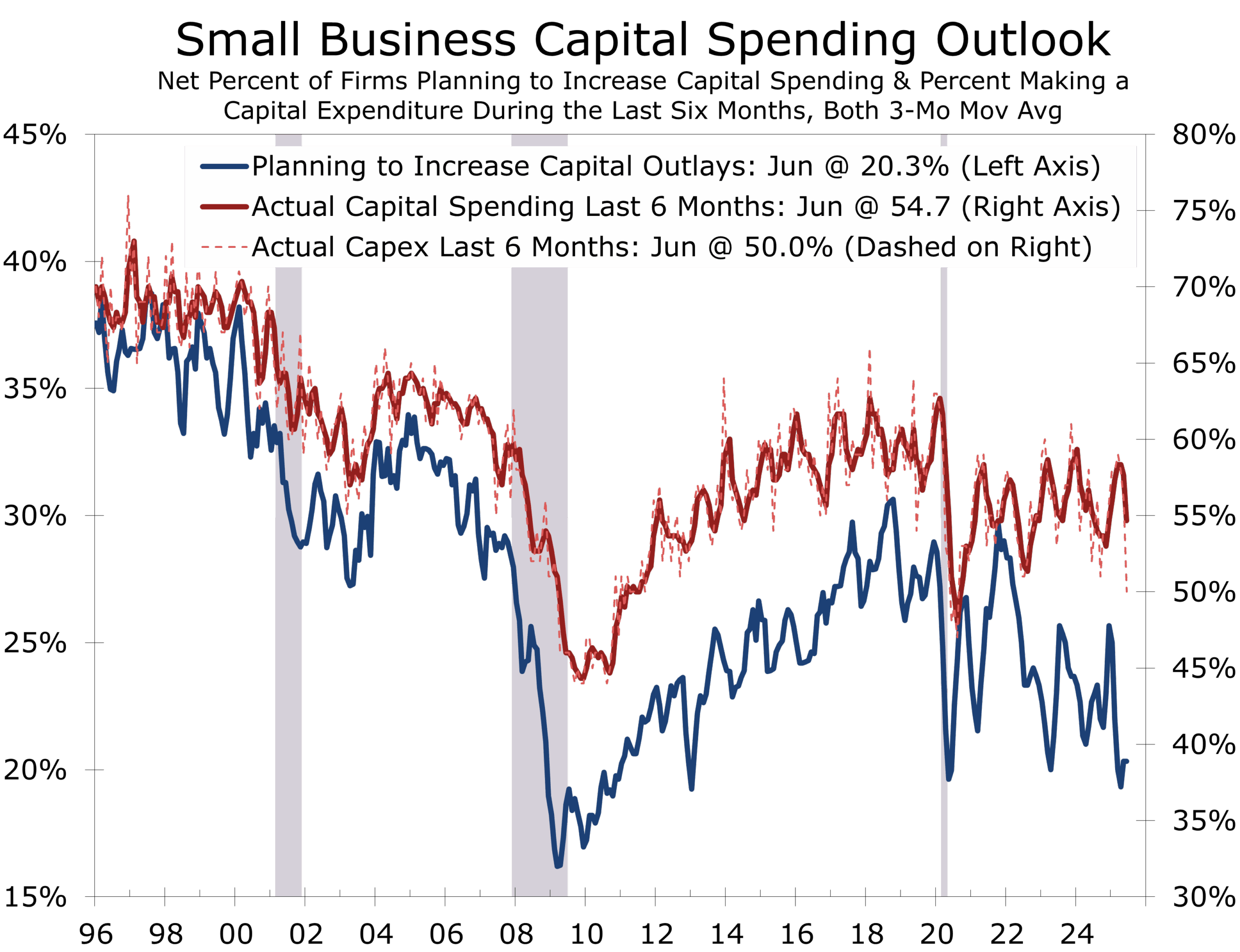 Capital spending fell sharply in June, with just 50% of firms reporting outlays—a 6-point drop from May and the weakest reading since August 2020. Equipment and vehicle purchases saw the largest declines. Only 21% plan to invest in the next six months, reflecting ongoing caution. The pullback came even as the Senate passed a tax bill restoring full expensing—suggesting some firms held back in anticipation of more favorable treatment. The stimulus will be welcome, but the response may be gradual.