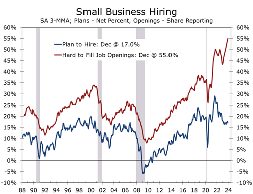 - December’s rise in Small Business Optimism further supports the growing consensus for a soft landing. While moderating final demand is limiting pricing power, rising wage pressures might still push inflation higher if the Fed eases too aggressively.