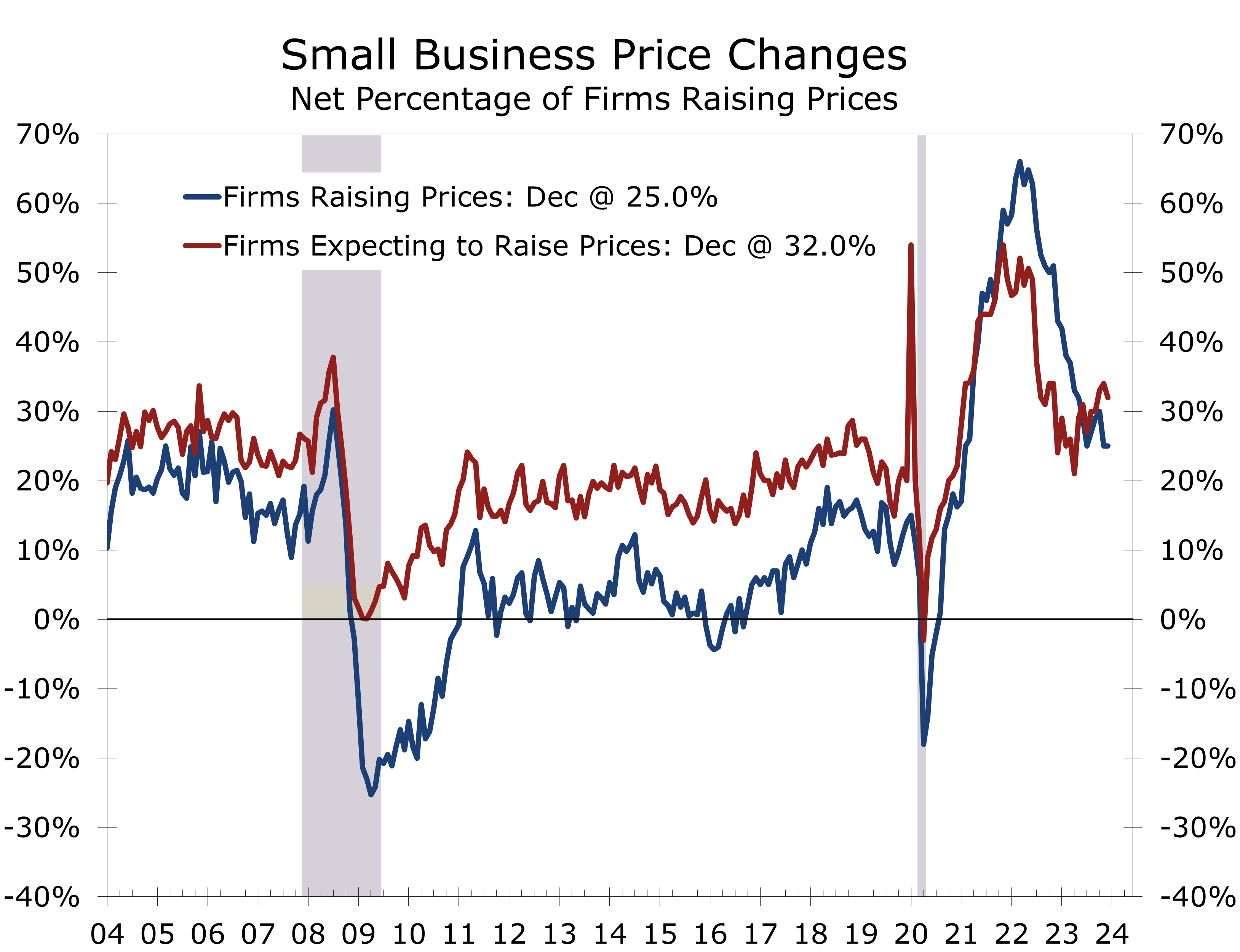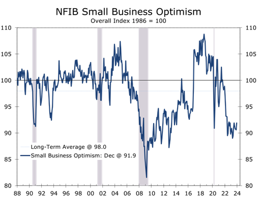 Small business confidence closed the year positively, with the NFIB Small Business Optimism Index rising 1.3 points to 91.9 in December, marking its highest level in five months. Despite this improvement, the index has remained below its 50-year average of 98 for the past 24 months. The index last reached or exceeded the average back in December 2021.