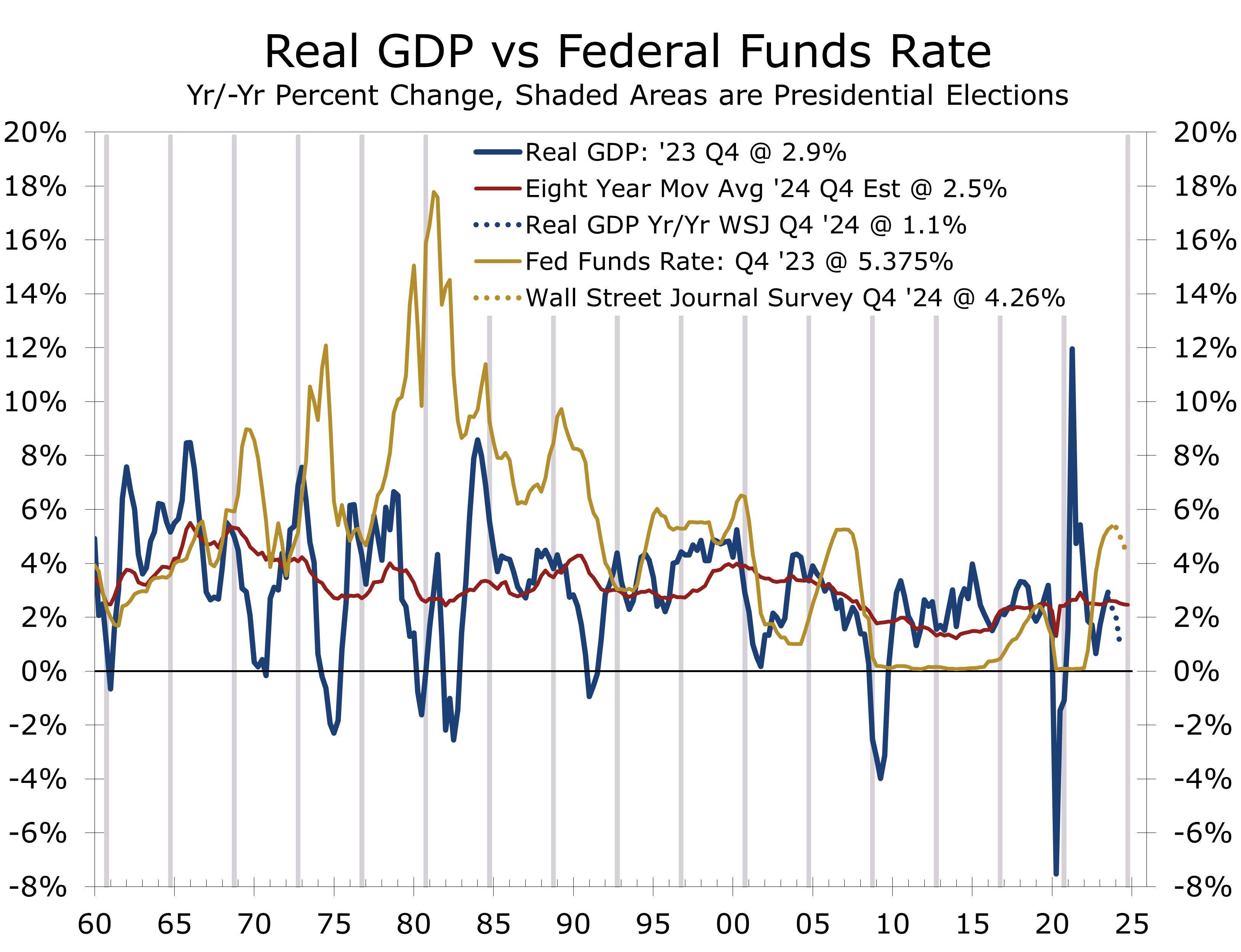 - The economy has had a decisive role in determining who wins or loses presidential elections. Over the past 16 presidential elections, dating back to 1960, the incumbent party has lost 7 of the 8 elections where the economy has grown less than its trailing 8-year average during the year leading up to the election and gone on to win 6 of 8 of the elections where real GDP growth in the year preceding the election was stronger than the previous 8 years. This measure has worked 81.25% of the time